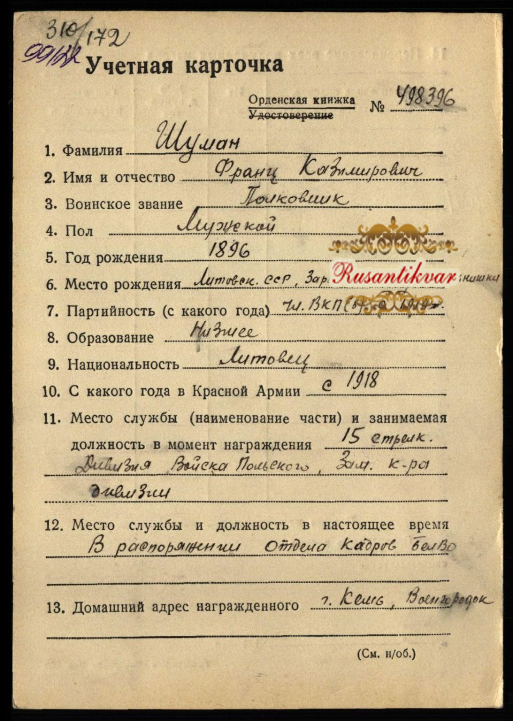 аждение было по Указу от 20 декабря 1932 г. По этому указу были награждены ответственные сотрудники ГПУ УССР и военнослужащие 2 - й конвойной дивизии в которой капитан Шуман Ф. К. командовал 9 конвойным батальоном (комдив - Зусманович Г. М., начштаба Сидоров И. Н., замполит Попов И. М., командиры конвойных батальонов Соколов М. Г., Шуман Ф. К.) .