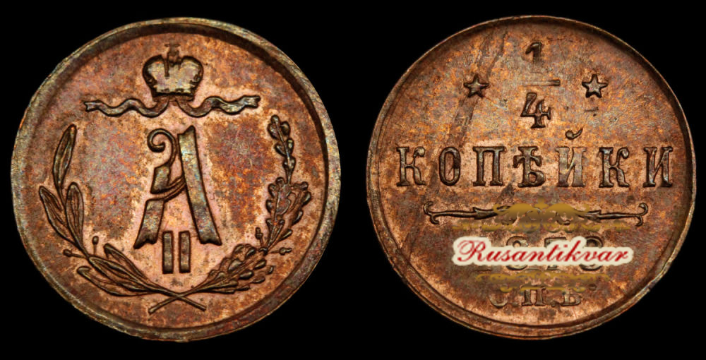 Период правления Императора Александра II (18 февраля 1855 - 1 марта 1881 гг). СПб Монетный двор. Медь. Тираж 1.100.000 экз. В. В. Биткин "Сводный каталог монет России" № 561. Сохранность AU/UNC.