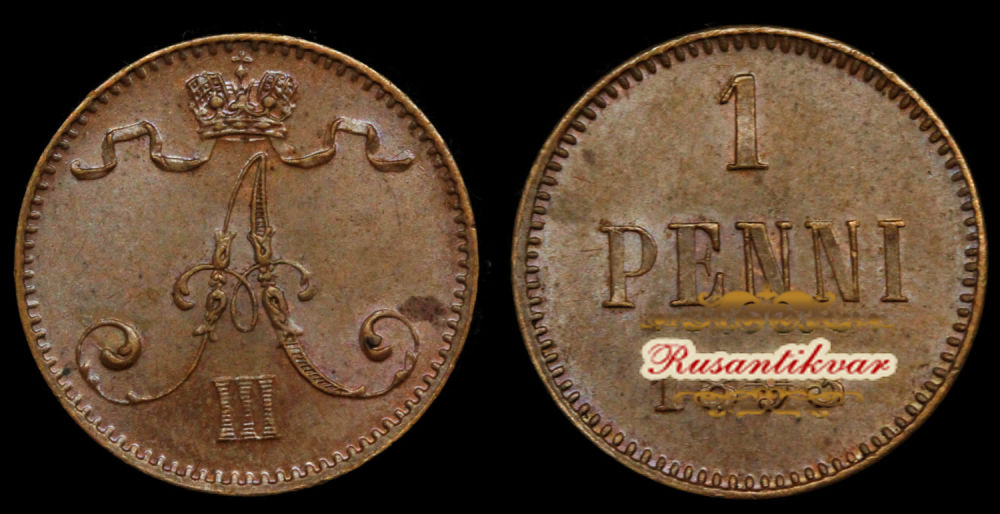 Период правления Императора Александра III (1 марта 1881 - 20 октября 1894 гг). Гельсингфорсский Монетный двор. Медь. Тираж 2.294.924 экз. В. В. Биткин "Сводный каталог монет России" № 256. В. В. Казаков" Монеты царствования Императора Александра III" № 792. Сохранность UNC.