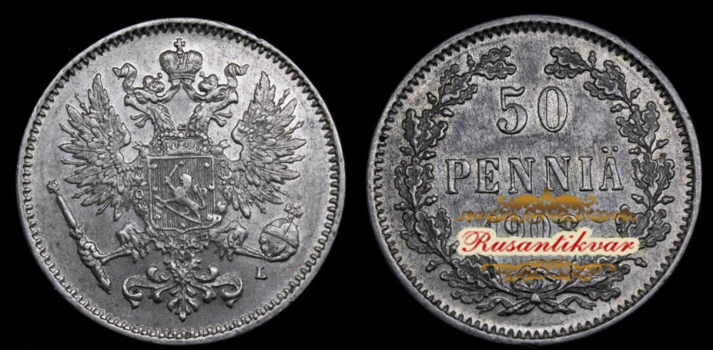 Период правления Императора Николая lI (20 октября 1894 - 2 марта 1917 гг). Гельсингфорсский Монетный двор. Серебро, 2.44 гр. Тираж 353.436 экз. В. В. Биткин "Сводный каталог монет России" № 403. В. В. Казаков "Монеты царствования Императора Николая II" № 354. Сохранность AU/UNC.