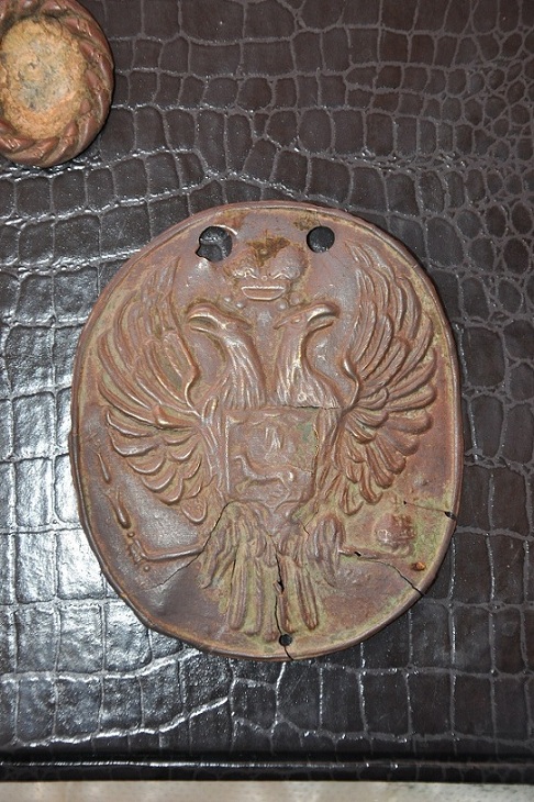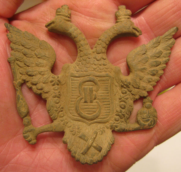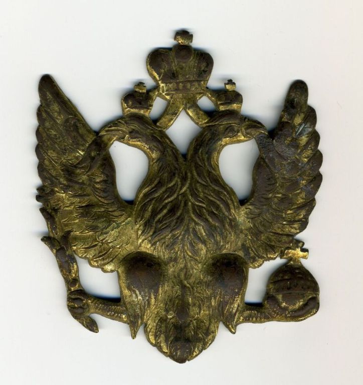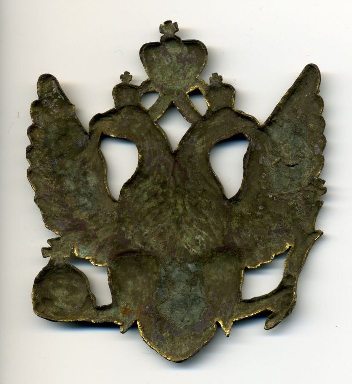 Бляха с нехарактерной деталью-Псковским гербом на груди гербового орла. Возможно принадлежала к униформе Псковских полков, а возможно и ведомственный знак.