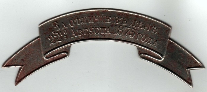 Знаки на головные уборы "За отличие в деле 22го августа 1875 года" пожалованы 26го авг. 1876 г. 2й Уральской сотне 4го Оренбургско- Уральского казачьего полка.