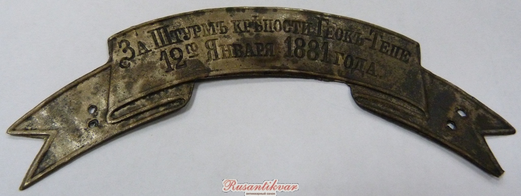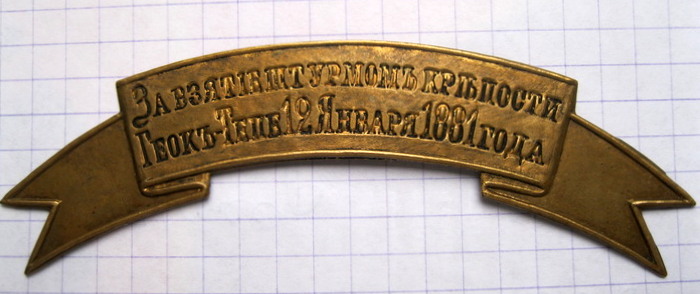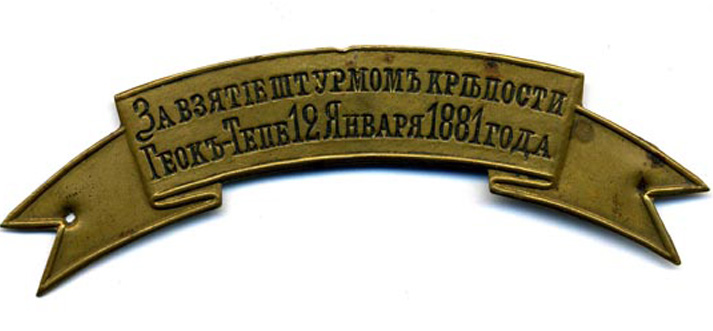 Знак на головные уборы " За взятие штурмом крепости Геок-Тепе 12 января 1881 года". Данный знак отличия был присвоен; 13му Туркестанскому стрелковому батальону; 5му Закаспийскому стрелковому генерал-адъютанта Скобелева батальону; 5й роте 6го Геок-Тепинского резервного батальона; 3му взводу 3й батареи 2й Туркестантской артиллерийской бригады; 1й и 2й ротам Туркестанского линейного №3 батальона ( в последующем 9й Туркестанский стрелковый полк)(Выс.пр. от 9го июня 1882 г); 1я,2я,3я,4я,5я и 6я роты Туркестанского линейного № 14 батальона ( в последующем 1й батальон 14го Туркестанского стрелкового полка)(Выс.пр. от 9го июня 1882 года); 2я рота Туркестанского линейного №19 батальона ( в последующем 19й Туркестанский стрелковый полк)(Выс.пр. от 9го июня 1882 года); 1й дивизион 43го драгунского Тверского полка (Выс.пр. от 4го июня 1882 года); 5я и 6я сотни 1го Лабинского полка К.К.В. (Выс.пр. от 4го июня 1882 года)(белый прибор); 1я,2я и3я сотни Оренбургского казачьего №2 полка ( в последующем 2й Оренбургский казачий полк)(Выс.пр. от 4го июня 1882 года)(белый прибор); 1я сотня 4го Исетско-Ставропольского полка О.К.В. ( в последующем 1я сотня 4го Оренбургского казачьего полка)(Выс.пр. от 9го июня 1882 года)(белый прибор); 5я сотня 2го Уральского казачьего полка (Выс.пр. от 6го февраля 1884 года)(белый прибор); 1я сотня 3го Уральского казачьего полка (Выс.пр. от 6го февраля 1884 года)(белый прибор); 6я батарея 21й артиллерийской бригады (Выс.пр. от 9го июня 1882 года); 3й взвод 3й батареи 2го Туркестанского стрелкового артиллерийского дивизиона (Выс.пр. от 9го июня 1882 года). *Лента имеет ряд отличий по написанию: 1) "За штурм крепости Геок-Тепе 12 января 1881 года". 2) " За штурм кр.Геок-Тепе 12 января 1881 года".