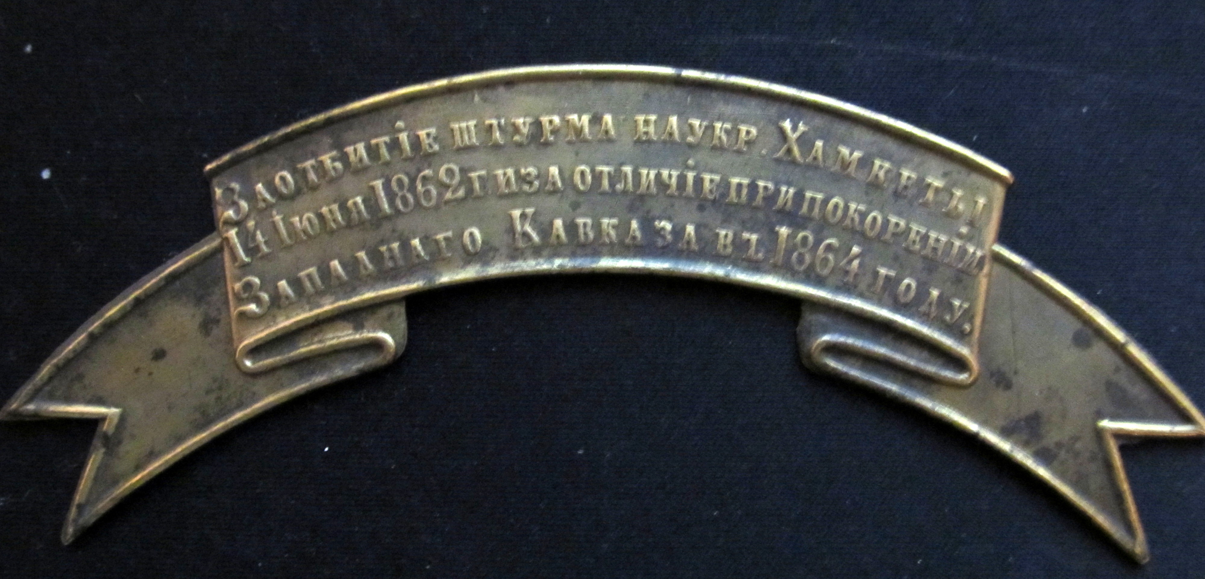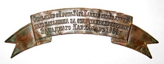 Знак отличия на головные уборы " За отбитие штурма на укреплении Хамнеты 14 июня 1862 года и за отличие при покорении Западного Кавказа в 1864 году." Данный знак был присвоен 14й,15й и 16й ротам 151го пехотного Пятигорского полка.
