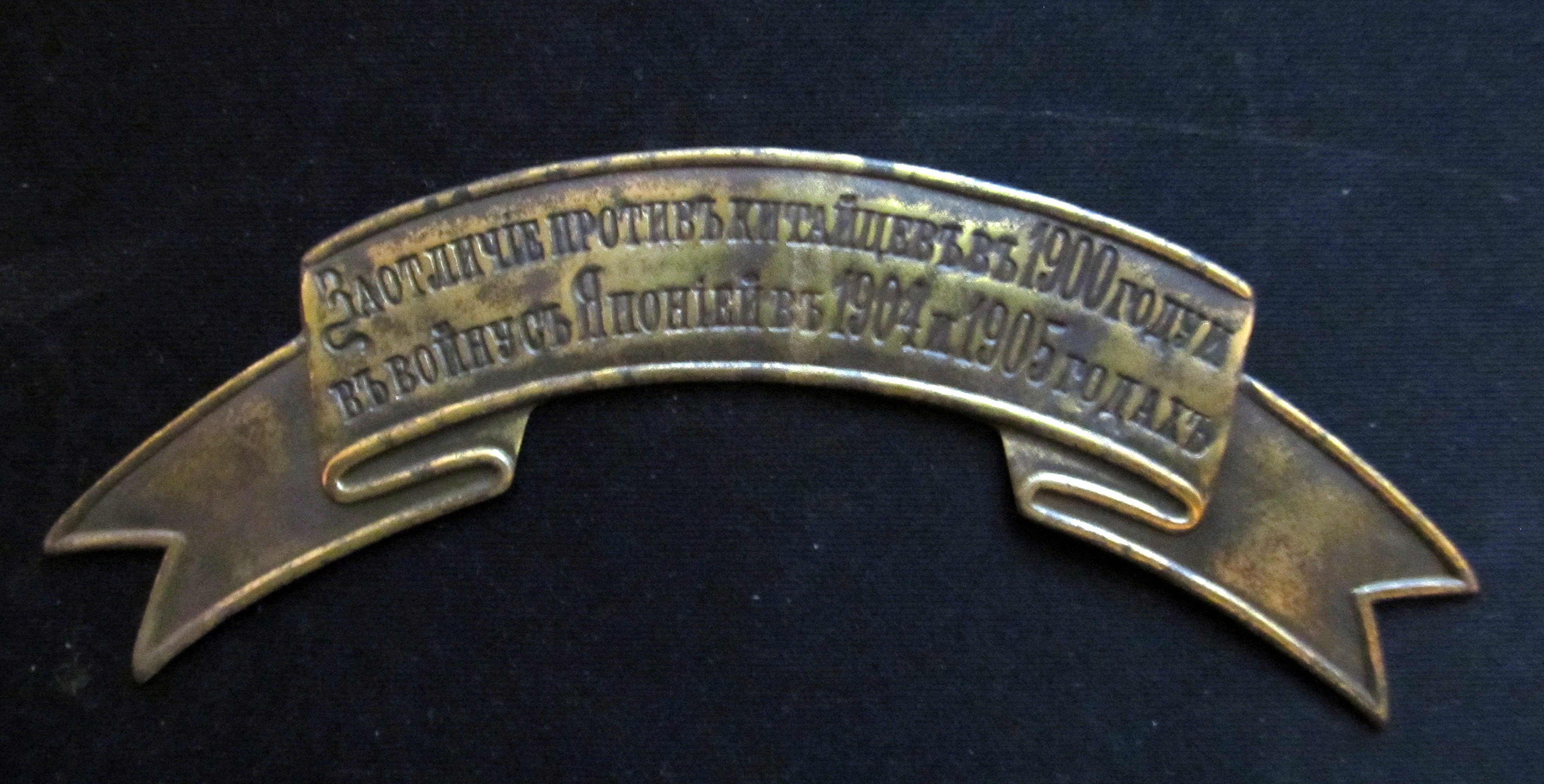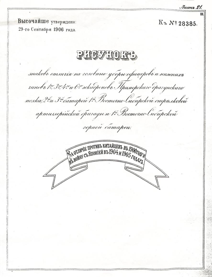 Знак отличия на головные уборы " За отличие против китайцев в 1900 году и в войну с Японией в 1904 и 1905 годах. Данные знаки были пожалованы 1му, 3му, 4му и 6му эскадронам Приморского драгунского полка ( Выс.пр. от 10го сентября 1906 г.); 2й и 3й батареям 1й Восточно-Сибирской стрелковой артиллерийской стрелковой бригады ( в последующем 2я и 3я батареи 1й Сибирской стрелковой артиллерийской бригады) ( Выс.пр. от 10го сентября 1906 г.); 1й батарее 1го Восточно-Сибирского горного артиллерийского дивизиона ( в последующем 1я батарея 1го Сибирского горного артиллерийского дивизиона) ( Выс.пр. от 10го сентября 1906 г.).