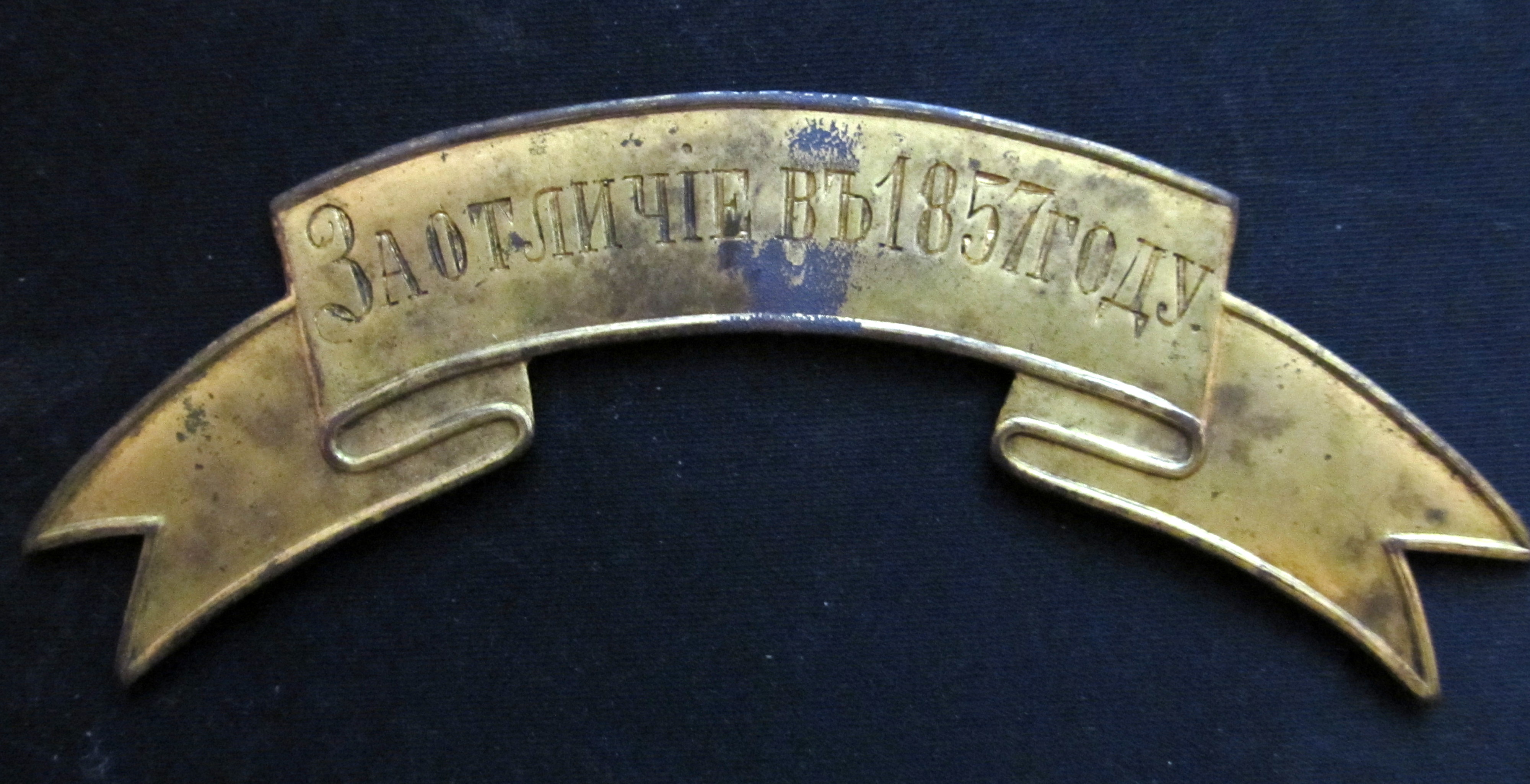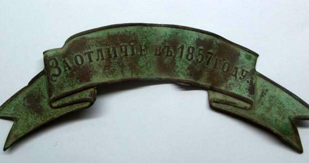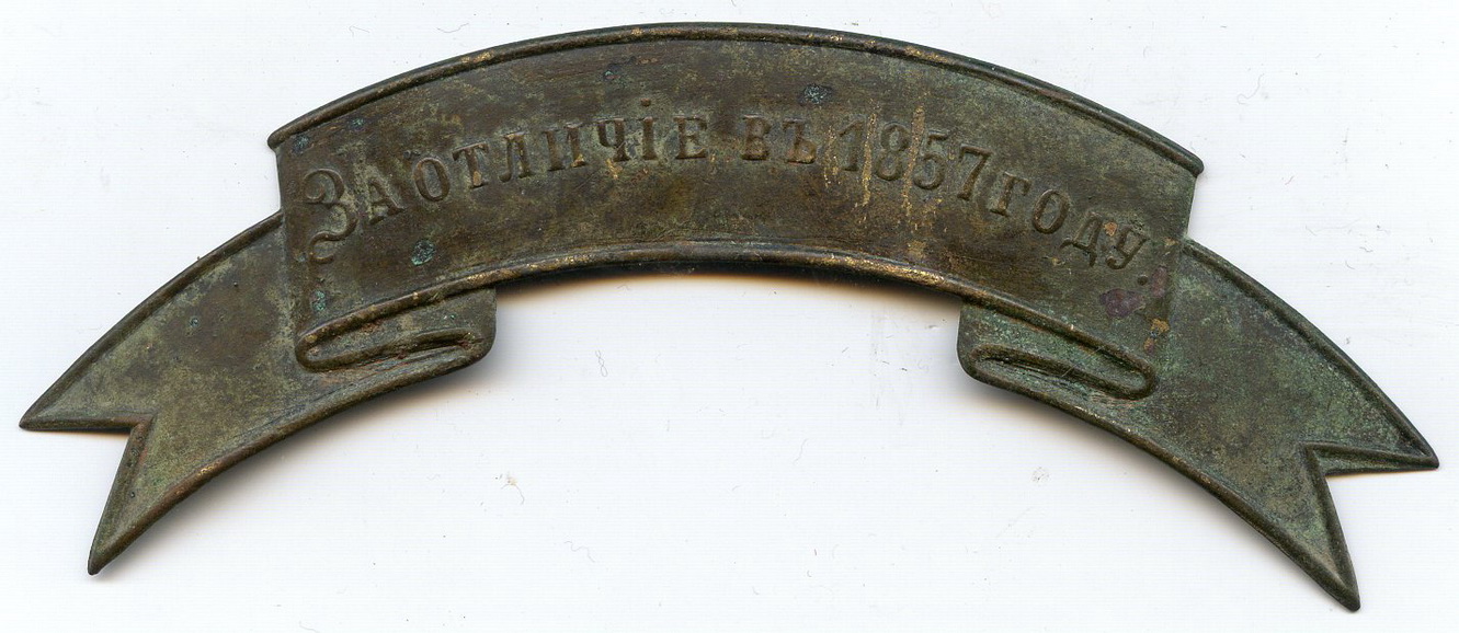 Знак отличия на головной убор " За отличие в 1857 году." Пожалованы 25.12.1858 года 81му пехотному Апшеронскому полку; 1му батальону 164го пехотного Закатальского полка ( Выс.пр. от 25го декабря 1858 г.).