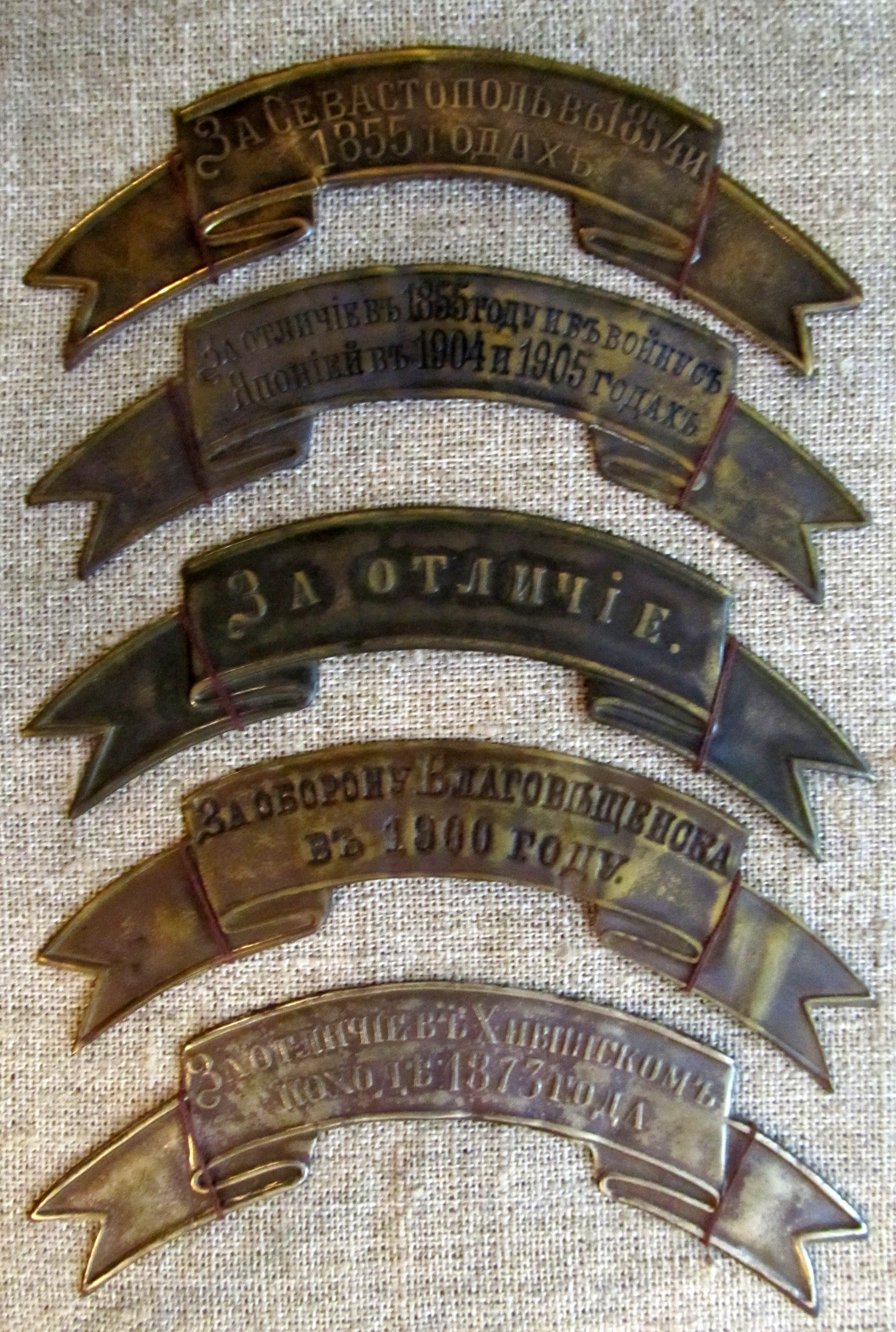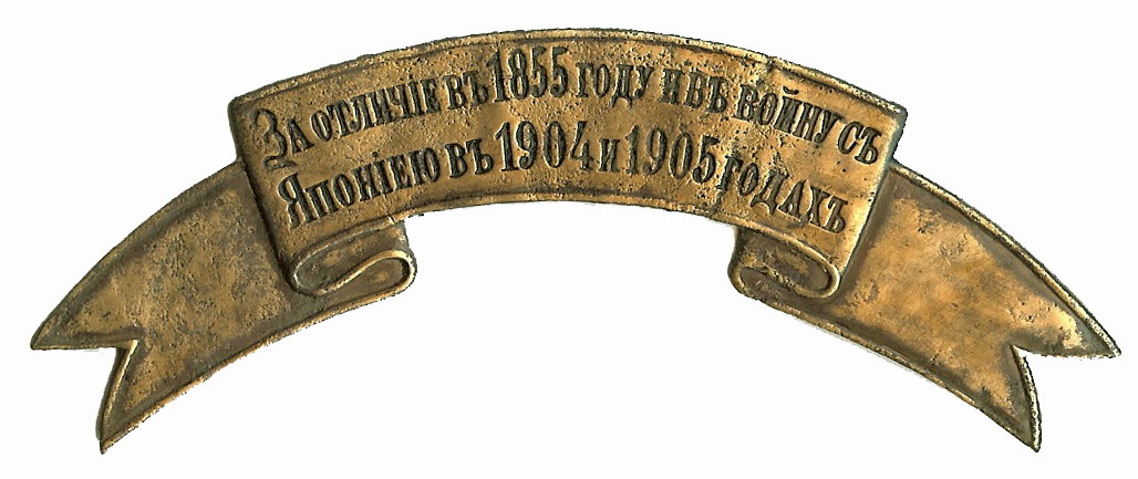 Лентой на головные уборы с надписью " За Севастополь в 1854 и 1855 годах" награждены: 28й пехотный Полоцкий полк ( Выс.пр. от 30го августа 1856 г.); 53 пехотный Волынский полк ( Выс.пр. от 30го августа 1856 г.); 54й пехотный Минский Его Величества Царя Болгарского полк ( Выс.пр. от 30го августа 1856 г.); 67й пехотный Тарутинский Великого Герцога Ольденбургского полк (Выс.пр. от 30го августа 1856 г.); 68й пехотный Бородинский Императора Александра III полк ( Выс.пр. от 30го августа 1856 г.); 1й и 4й батальоны 125го пехотного Курского полка ( Выс.пр. от 30го августа 1856 г.); 1й,2й и 4й батальоны 131го пехотного Тираспольского полка ( Выс.пр. от 30го августа 1856 г.); 4я и 5я батареи 10й артиллерийской бригады ( Выс.пр.от 30го августа 1856г); 4я батарея 11й артиллерийской бригады ( Выс.пр. от 30го августа 1856 г.); 4я и 5я батареи 12й артиллерийской бригады ( Выс.пр. от 30го августа 1856 г.); 5я батарея 16й артиллерийской бригады ( Выс.пр. от 30го августа 1856 г.); 4я и 5я батареи 17й артиллерийской бригады ( Выс.пр. от 30го августа 1856 г.); 1я батарея 36й артиллерийской бригады ( Выс.пр.от 30го августа 1856 года.); 4я батарея 3й Сибирской стрелковой артиллерийской бригады ( Выс.пр. от 30го августа 1856 г.); 4й сапёрный батальон ( Выс.пр. от 30го августа 1856 г.) в белом приборе. Лентой на головные уборы с надписью " За отличие в Хивинском походе 1873 года." награждены: 1я и 3я сотни 2го Уральского казачьего полка ( пожалованы 12го марта 1882 года) ( первоначально были пожалованы 1й и 3й сотням Уральского казачьего войска, от 17го апреля 1875 года); 2я и 3я сотни 6го Оренбургского казачьего полка ( пожалованы 12го марта 1882 года); 1я сотня 1го Семиреченского казачьего генерала Колпаковского полка (пожалованы 17го апреля 1875 года); 1й взвод 3й Оренбургской казачьей батареи (пожалованы 17го апреля 1875 года); 1й и 2й взвода 2й Оренбургской казачьей батареи (пожалованы 17го апреля 1875 года); Ленты на головные уборы с надписью " За отличие в 1855 году и в войну с Японией в 1904 и 1905 годах" полагались в 1м батальоне 4го стрелкового полка. Знаки на головные уборы с надписью " За оборону Благовещенска в 1900 году." полагались в 9й роте 37го Сибирского стрелкового полка, пожалованы 19 февраля 1903 года Благовещенской местной команде и переданные 1й роте Благовещенского резервного батальона.