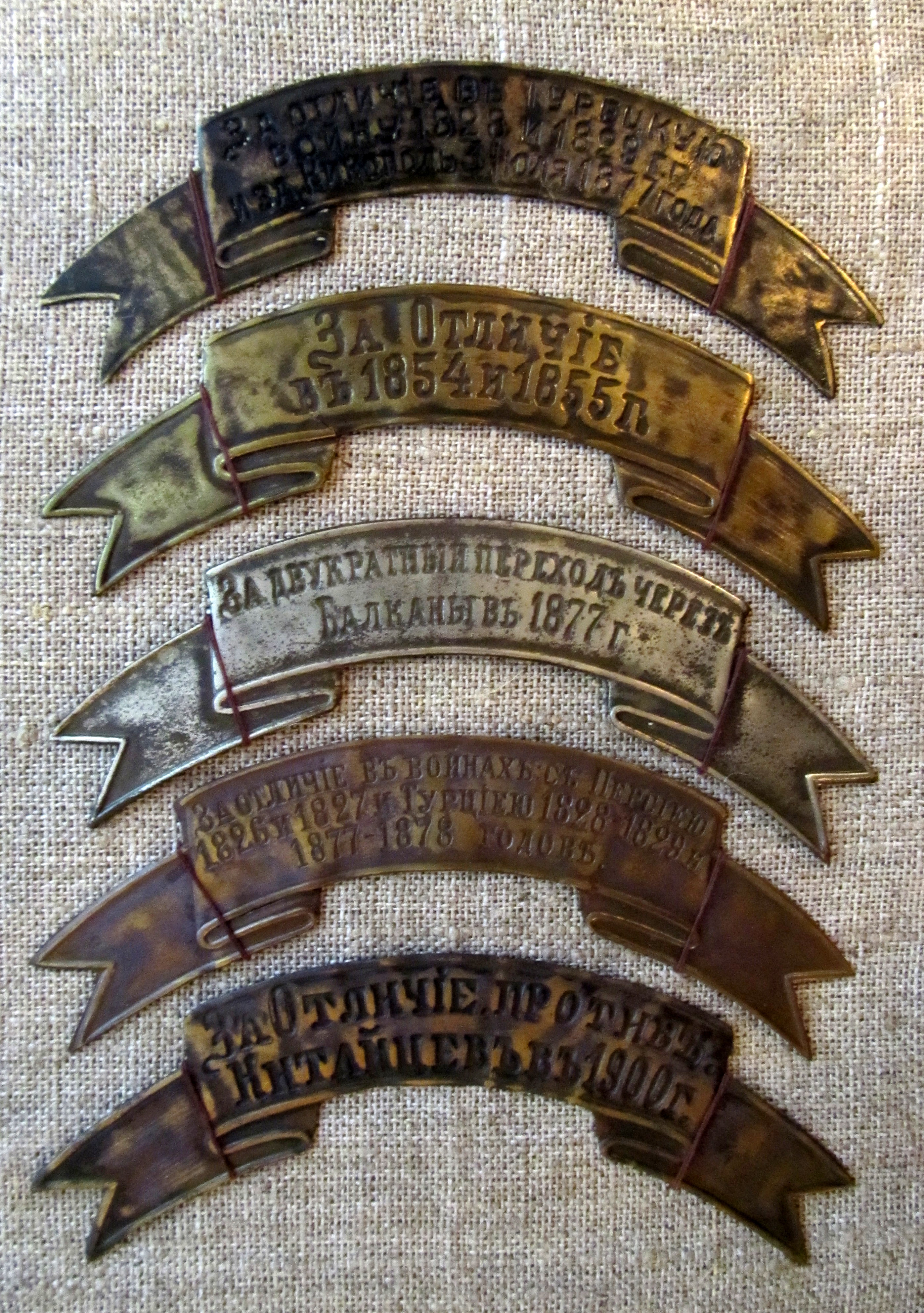 Лентой с надписью " За отличие в 1854 и 1855 годах" награждены: 51й пехотный Литовский полк ( Выс.пр. от 30го августа 1856 г.); 1й и 2й батальоны 52го пехотного Виленского полка ( Выс.пр. от 30го августа 1856 г.); 2й батальон 70 пехотного Ряжского полка ( Выс.пр. от 30го августа 1856 г.); 6й стрелковый батальон ( в последующем 16й стрелковый Императора Александра III полк) ( Выс.пр. от 30го августа 1856 г.); 1я батарея 11й артиллерийской бригады ( Выс.пр. от 30го августа 1856 г.); 1я батарея 17й артиллерийской бригады ( Выс.пр. от 30го августа 1856 г.); Донская конно-артиллерийская батарея №6 ( впоследующем 6я Донская казачья батарея) ( Выс.пр. от 30го августа 1856 г.). Ленты с надписью " За двукратный переход через Балканы в 1877 году" полагались 21му Донскому казачьему полку. Знаки отличия на головные уборы с надписью " За отличие в войнах: С Персией 1826-1827 г.г. и Турцией 1828-1829 и 1877-1878 годов." полагались в 1м взводе 5й Донской казачьей батареи ( пожалованы 23го октября 1879 г.) Знаки отличий на головные уборы с надписью "За отличие в Турецкую войну 1828 и 1829 годов и за Никополь 3го июля 1877 года." были положены в в 1м взводе 2й Донской казачьей батареи (пожалованы 20 декабря 1880 г.)