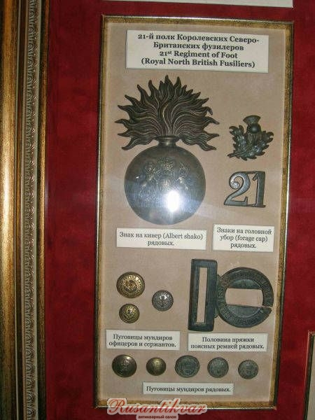 Стенд с предметами 21-го Королевских Северобританских фузилеров полка из коллекции музея Шереметьевых .