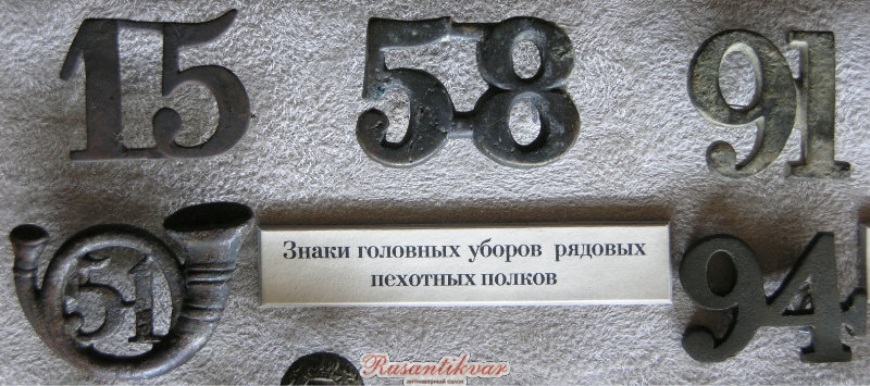 Знаки с фуражных шапок нижних чинов полков, официально не принимавших участия в Врымской войне, найденных в Севастополе, из коллекции Музея Шереметьевых: