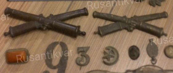 Пушки большие и малые ( с кивера и патронной сумки ). А так же цифра три - тоже с кивера артиллериста ( хорошо видно своеобразное крепление номерка . Снизу проволочка , а с верхнего края застежка как на колпачке шариковой ручки ). Номерки были наборные. Так что этот номерок носил или нижний чин 3-го пешего артиллерийского полка или 13-го полка ездящей ( во многих источниках она названа линейной ) артиллерии.
