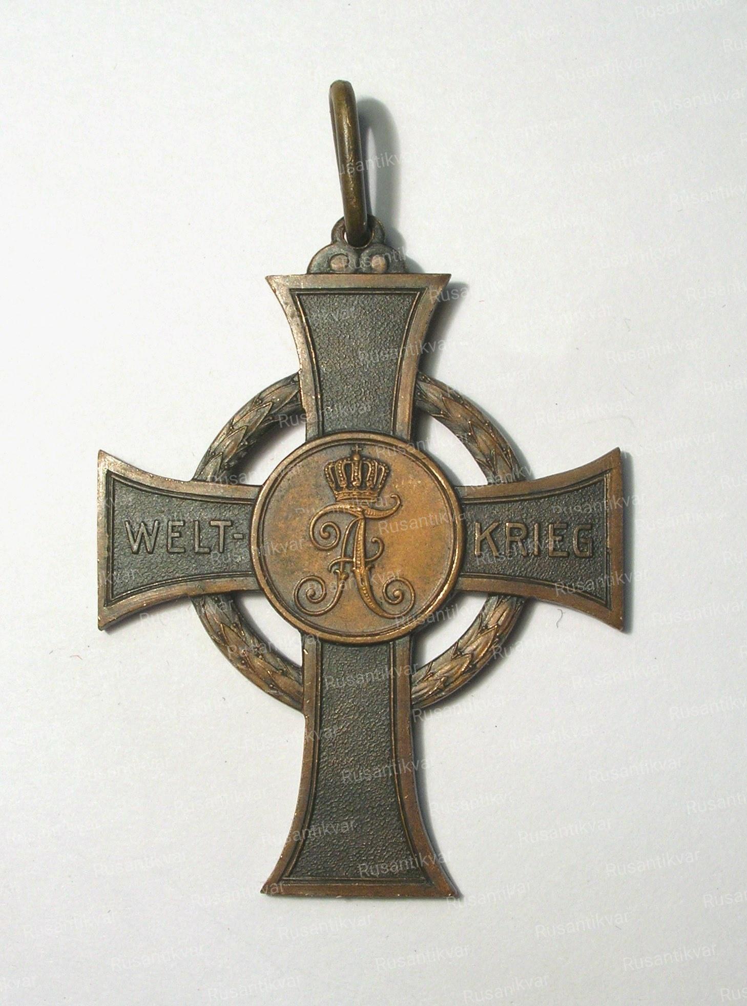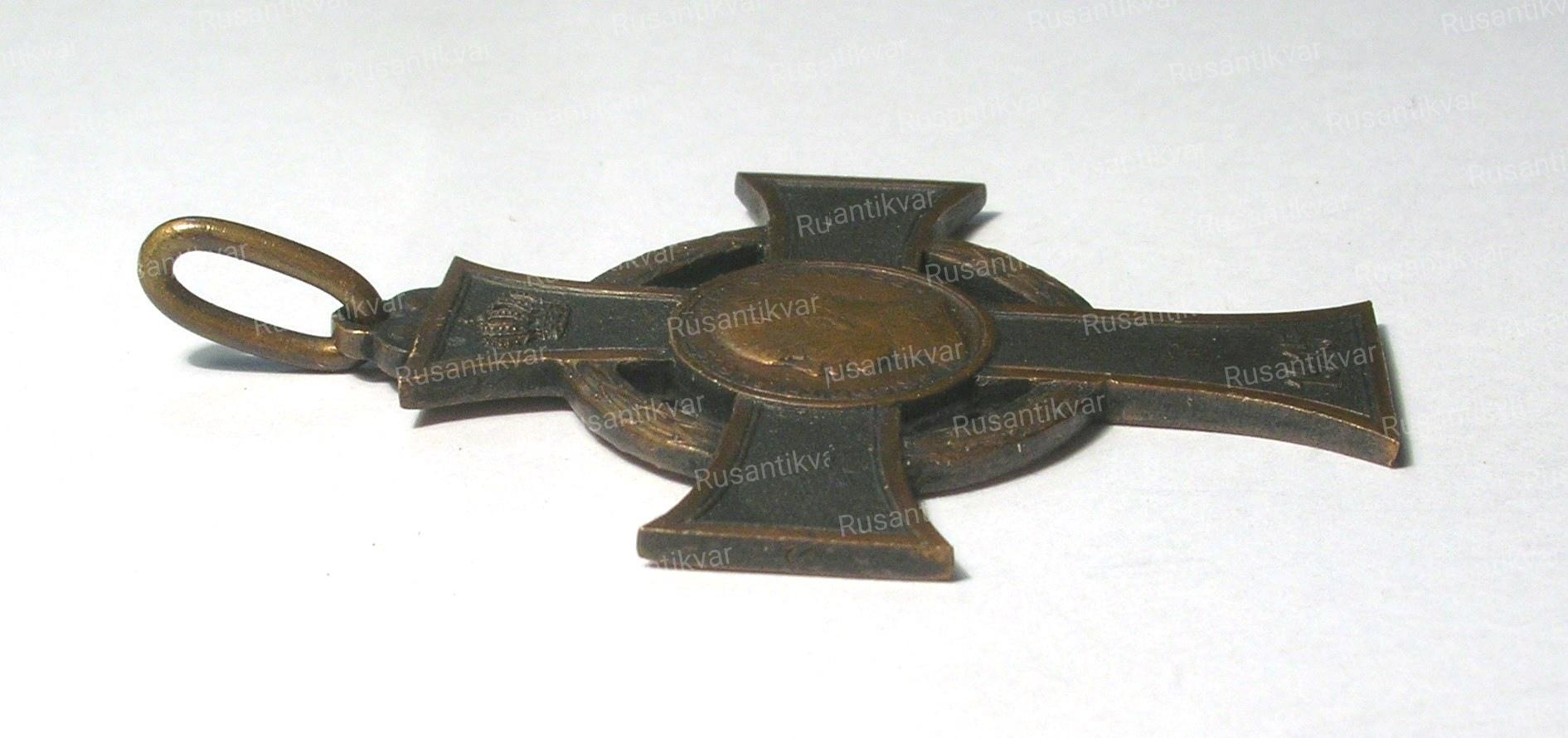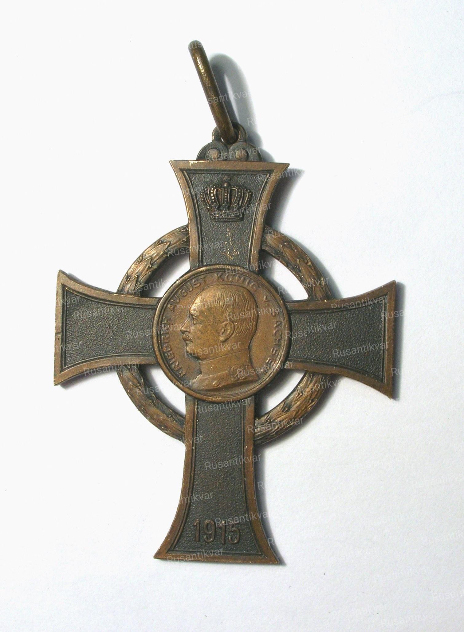 Крест выполнен из бронзы, нижний конец креста длиннее остальных, между концами креста - лавровый венок. В центральном медальоне - портрет короля Фридриха Августа. Лента зелёная, с белыми полосами по краю, и жёлто-голубой каймой.