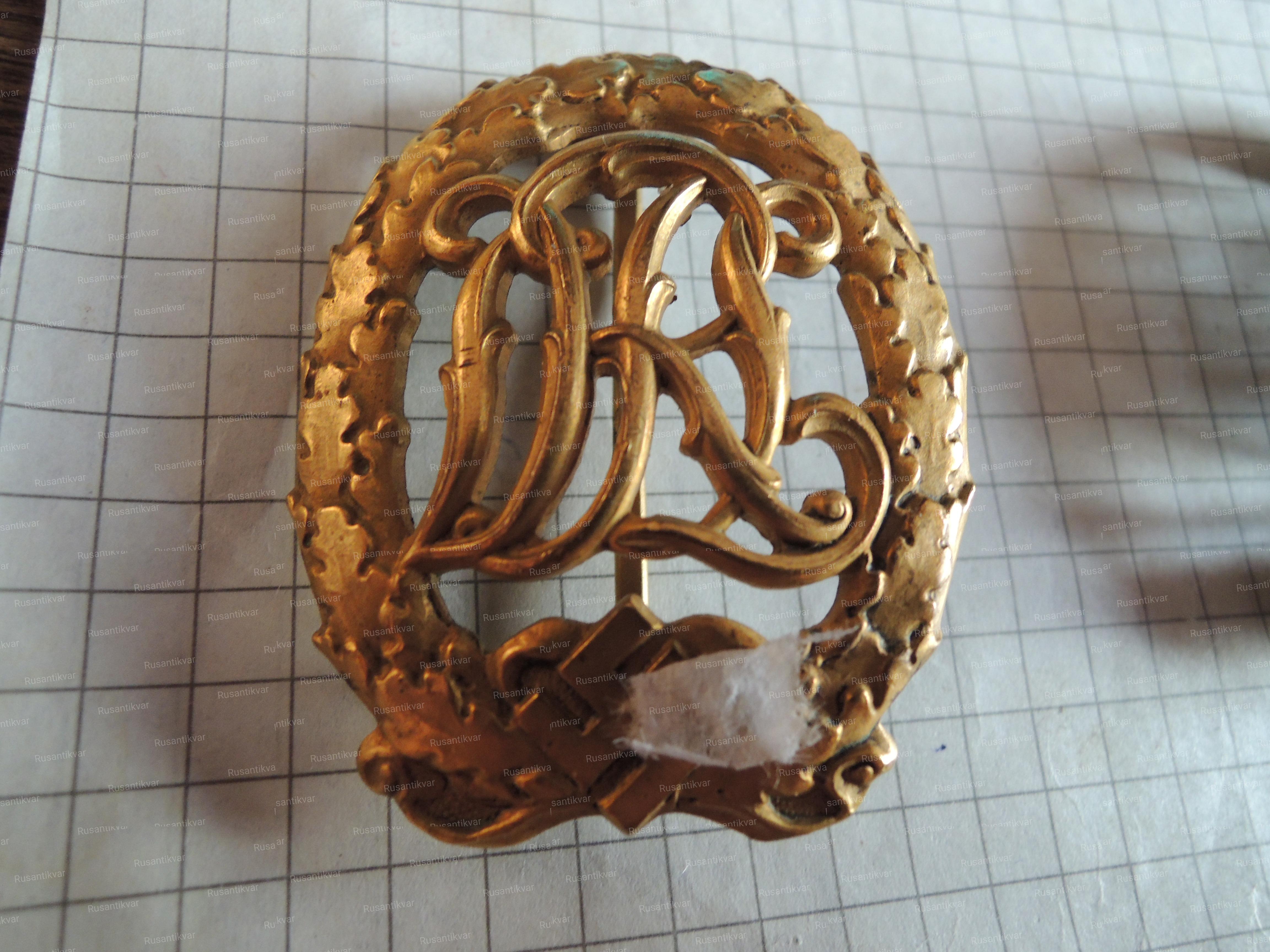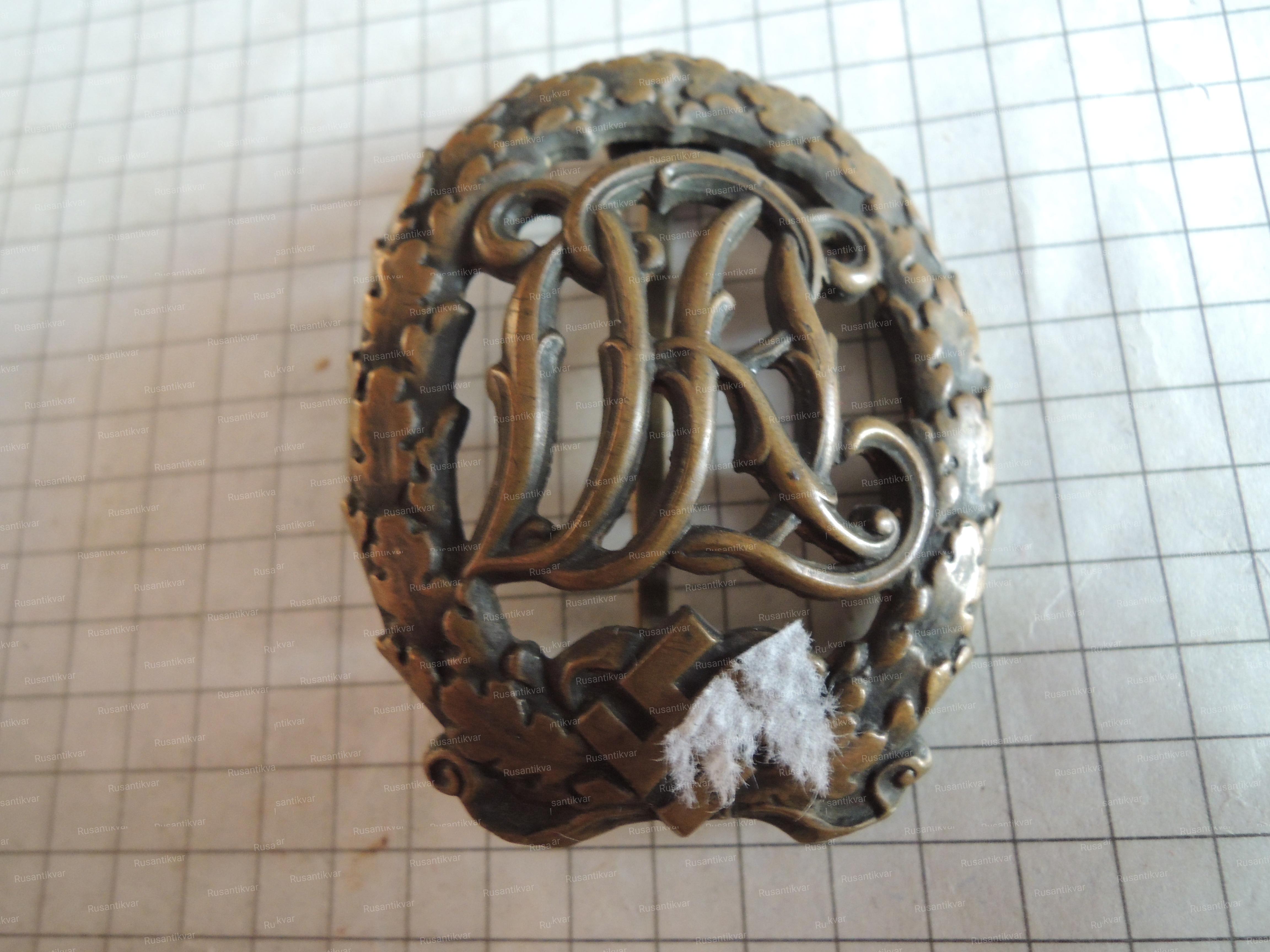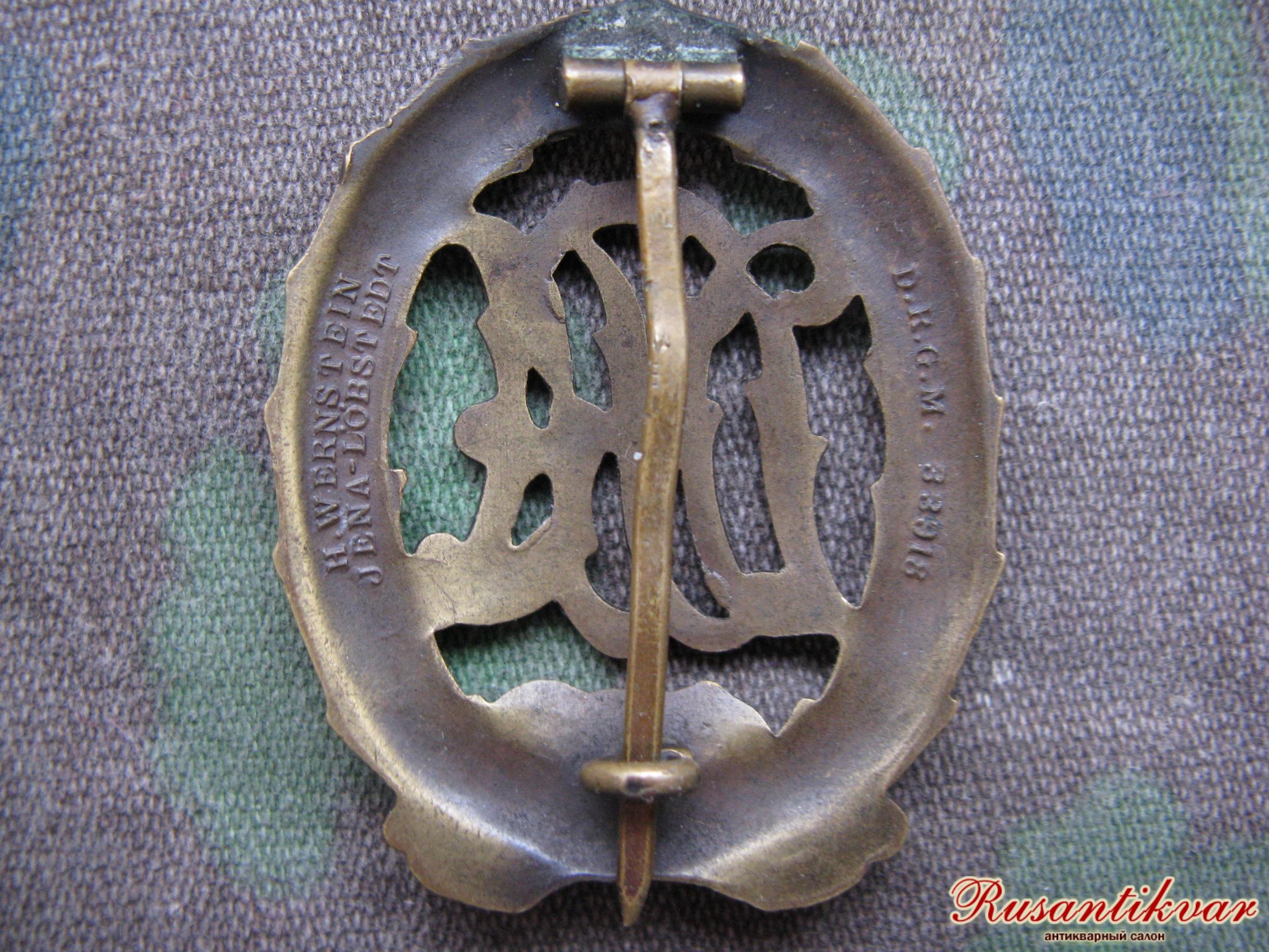 На фото - Спортивный квалификационный знак (значок) DRA «в бронзе» 3 класса. Германия, Веймарская Республика. Производственный выпуск 1920-1933 гг. Аверс: монограмма вязью из трех латинских букв немецкой аббревиатуры DRA — Deutsche Reichsausschuss (Германский Имперский комитет). Обод из дубовых листьев — символ победителей.