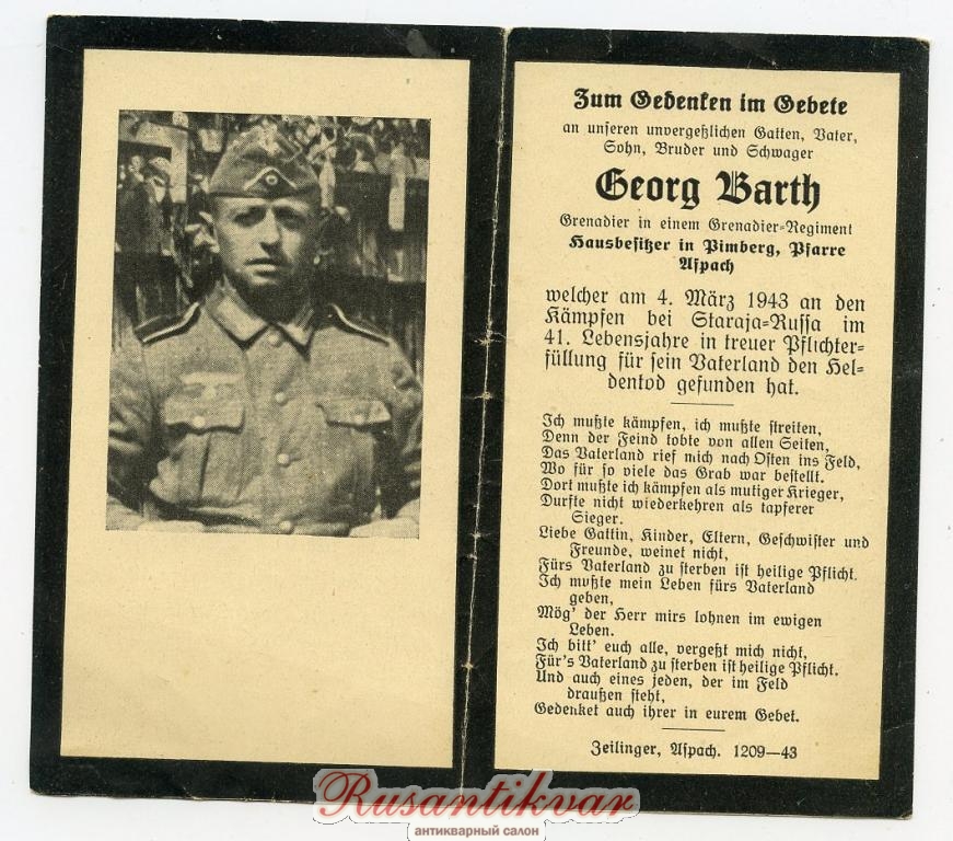 Гренадёр Георг Барт.Погиб 4 марта 1943 года под СТАРОЙ РУССОЙ в возрасте 41 год.