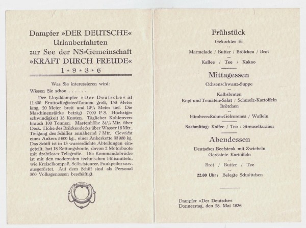 KdF (Национал-социалистическое объединение "Сила через Радость"). Морской круиз на пароходе "Германец" 1936 год . Приглашение на ужин.