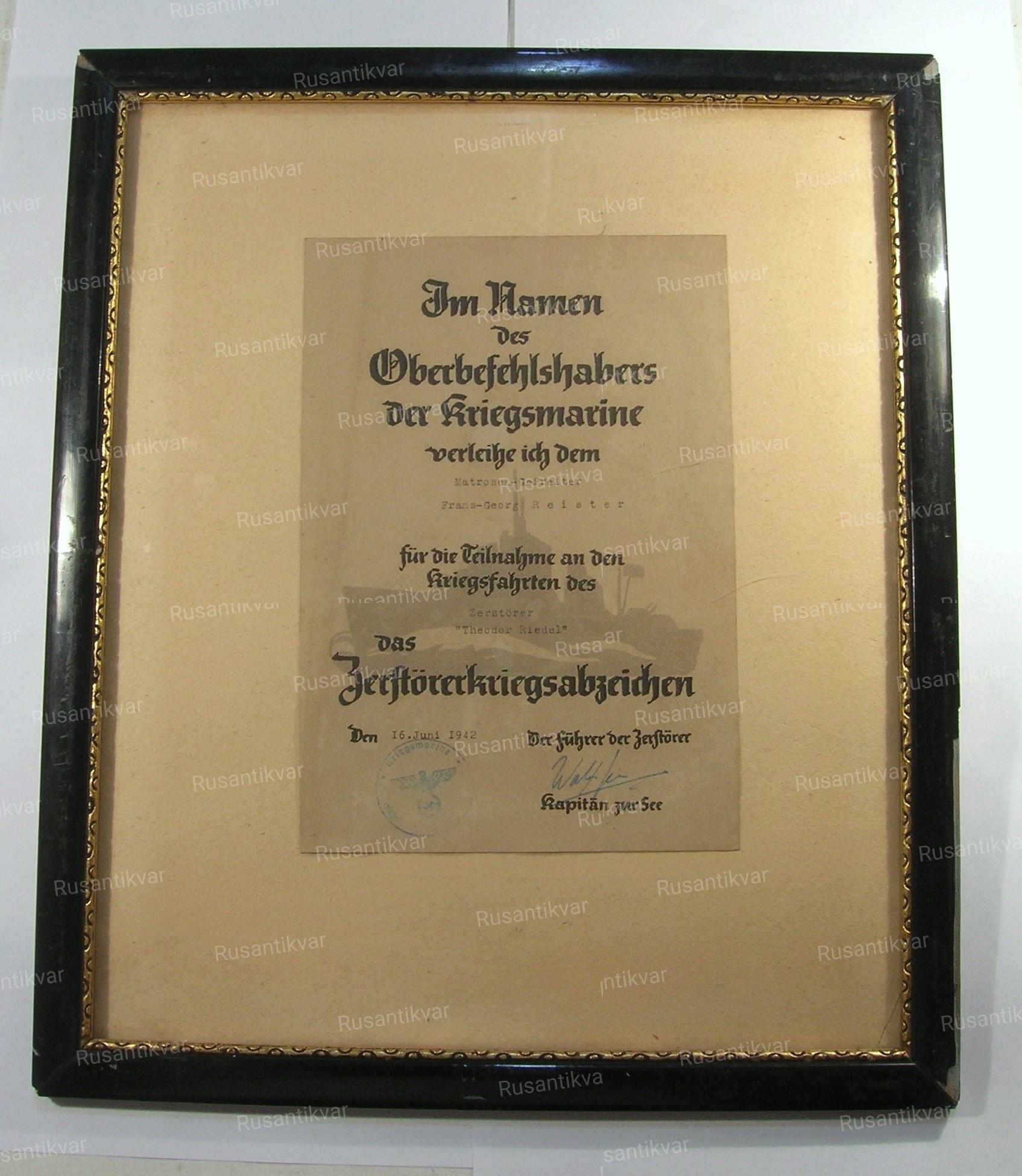 Наградной документ на знак эсминца, в раме. Размер рамы 33х39 см . 1942 год. Эсминец "Теодор Ридель " .