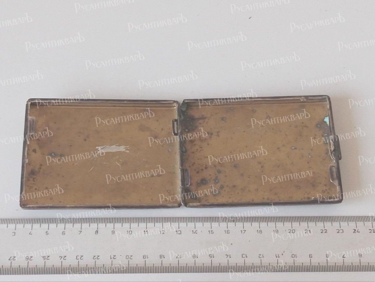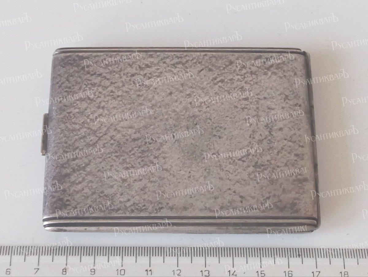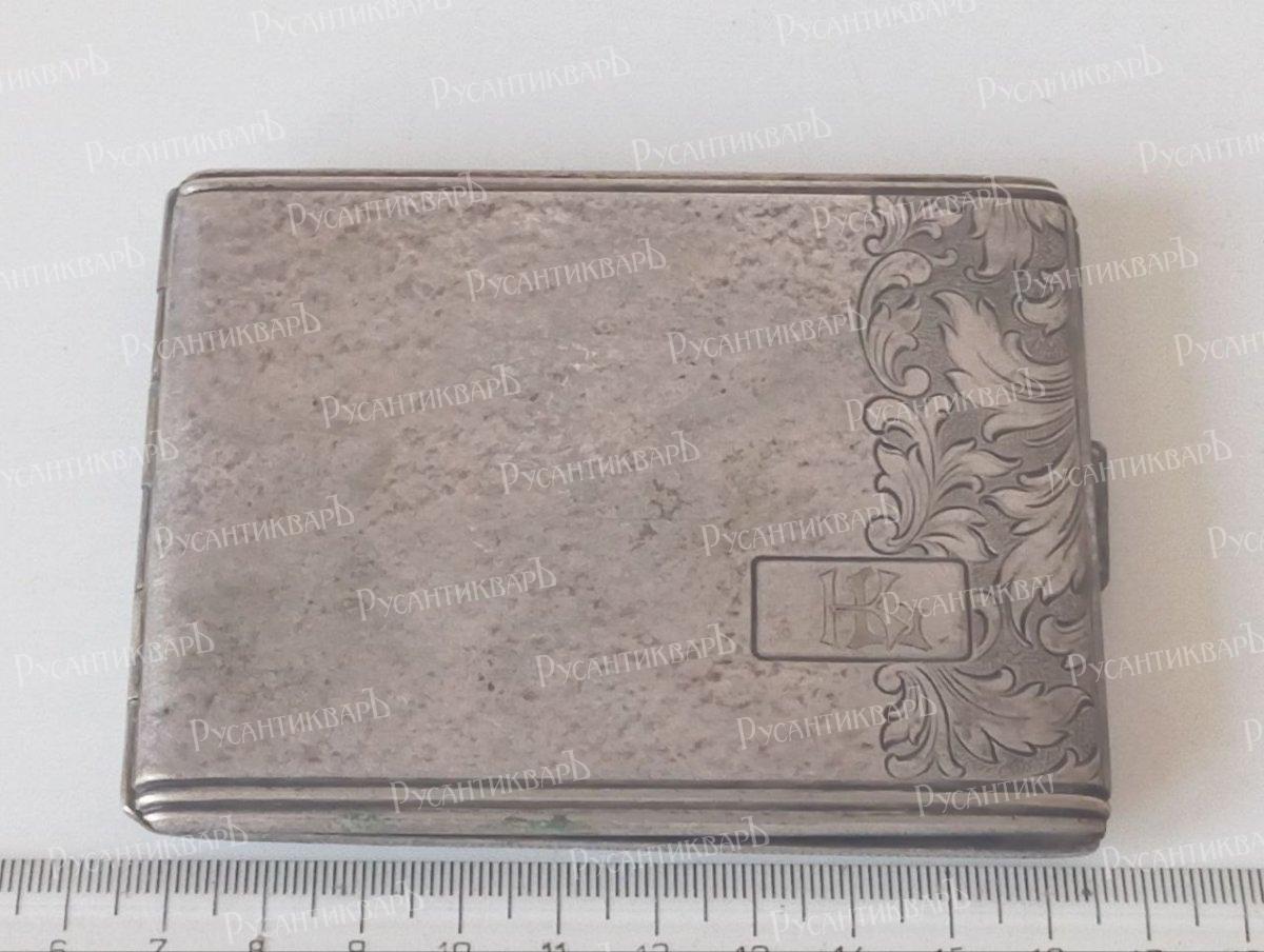 Портсигар, Альпака (мельхиор), Рейх, клеймо Alpacca на кнопке . Крышка при нажатии на кнопку откидывается автоматически . Монограмма владельца. Размеры внешние -10х7,5 см