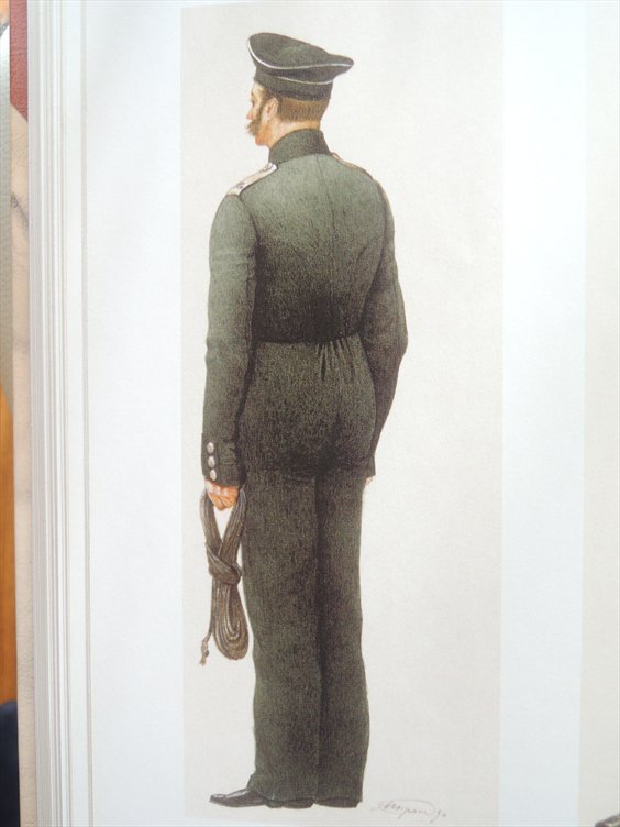 Матром военных портовых рот 1851г. В эти годы мундир нижних чинов представлял собой темно-зеленого цвета куртку без фалд со стоячим воротником и белыми погонами с черной цифрой обозначавшей номер роты, темно зеленые брюки, фуражку без козырька и черные башмаки.