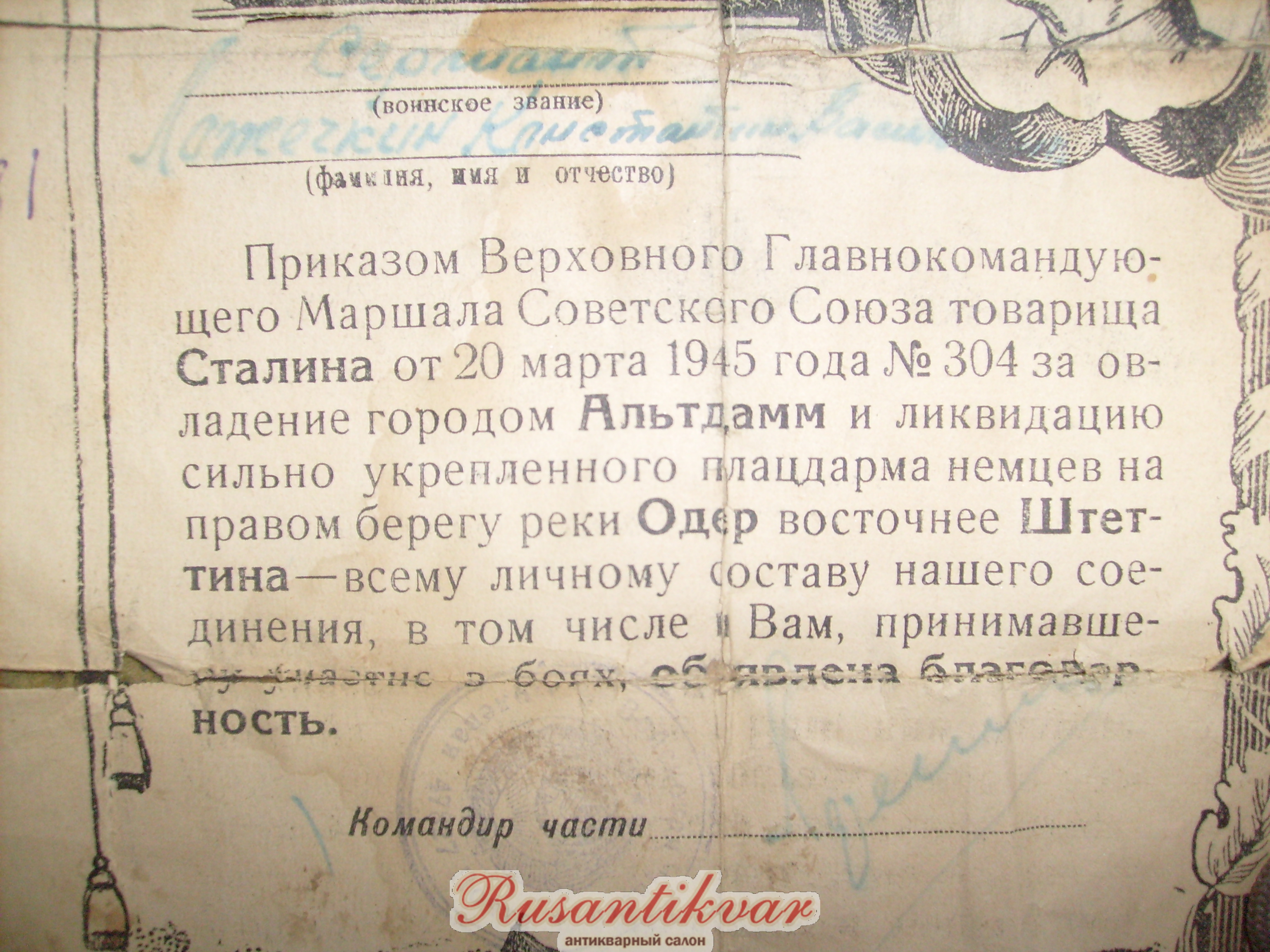 Дед воевал на 1 Белорусском фронте,два ордена Красной Звезды,12 благодарностей командующего фронтом.медали За Освобождение Варшавы.Взятие Берлина.Победу Над Германией.после 2-х тяжелых ранений"на фото две красные лычки",в марте 1945 года был переведен в Отдельную Ордена Александра Невского Трофейную бригаду.4 батальон,1 рота,должность старшина роты,звание-ст.сержант.Много чего привез.В огороде были траншеи.До сих пор валяется плита на речке от миномета GR W 34.300 м от дома.Есть его школьный атестат с датой выдачи 22 июня 1941г.