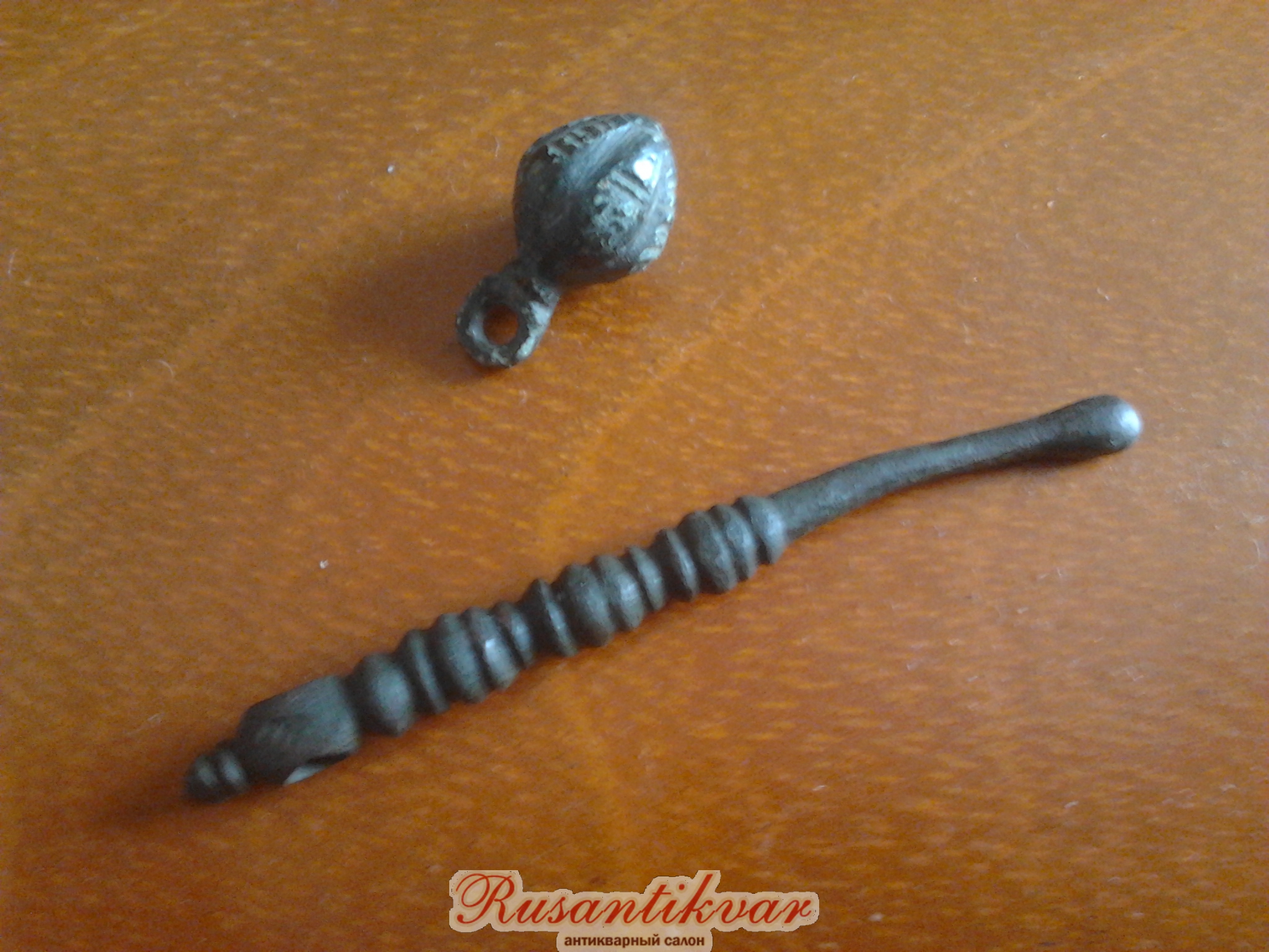 Сие есмь велми занятные и зело патриархальные вещицы.Одна из них палочка с петелькой и лопаточкой на конце ничто иное как "копоушка"- предмет личной гигиены для чистки ушей,носилась на цепочке или верёвочке пристегнутая к одежде.Размерная пуговка -"кафтанка" форма характерная для 17-го века,застегивалась на одежде с помощью веревочной или кожаной накидной петельки(современные встрочные петли появились позже)Обе вещички примерно одного периода.