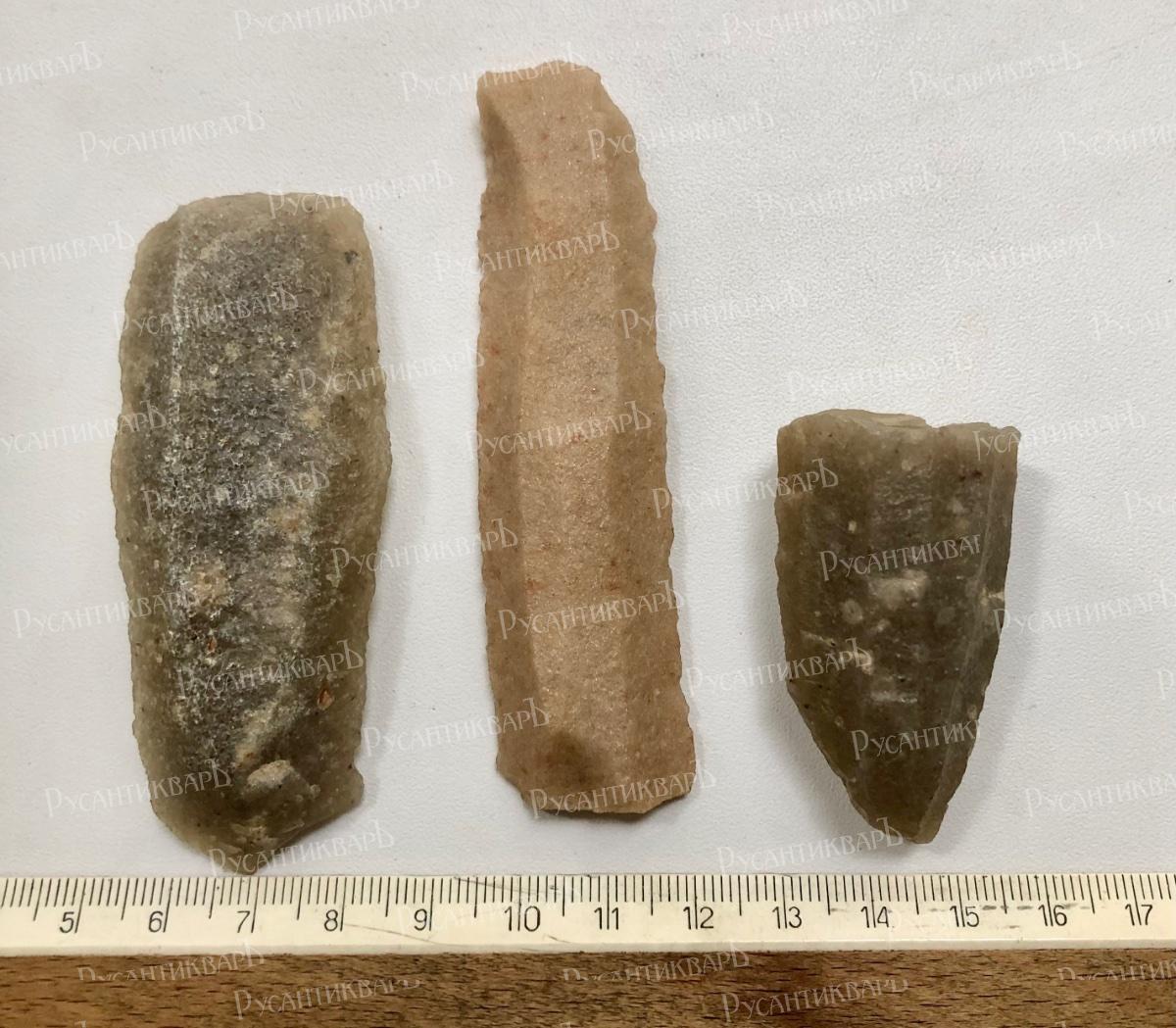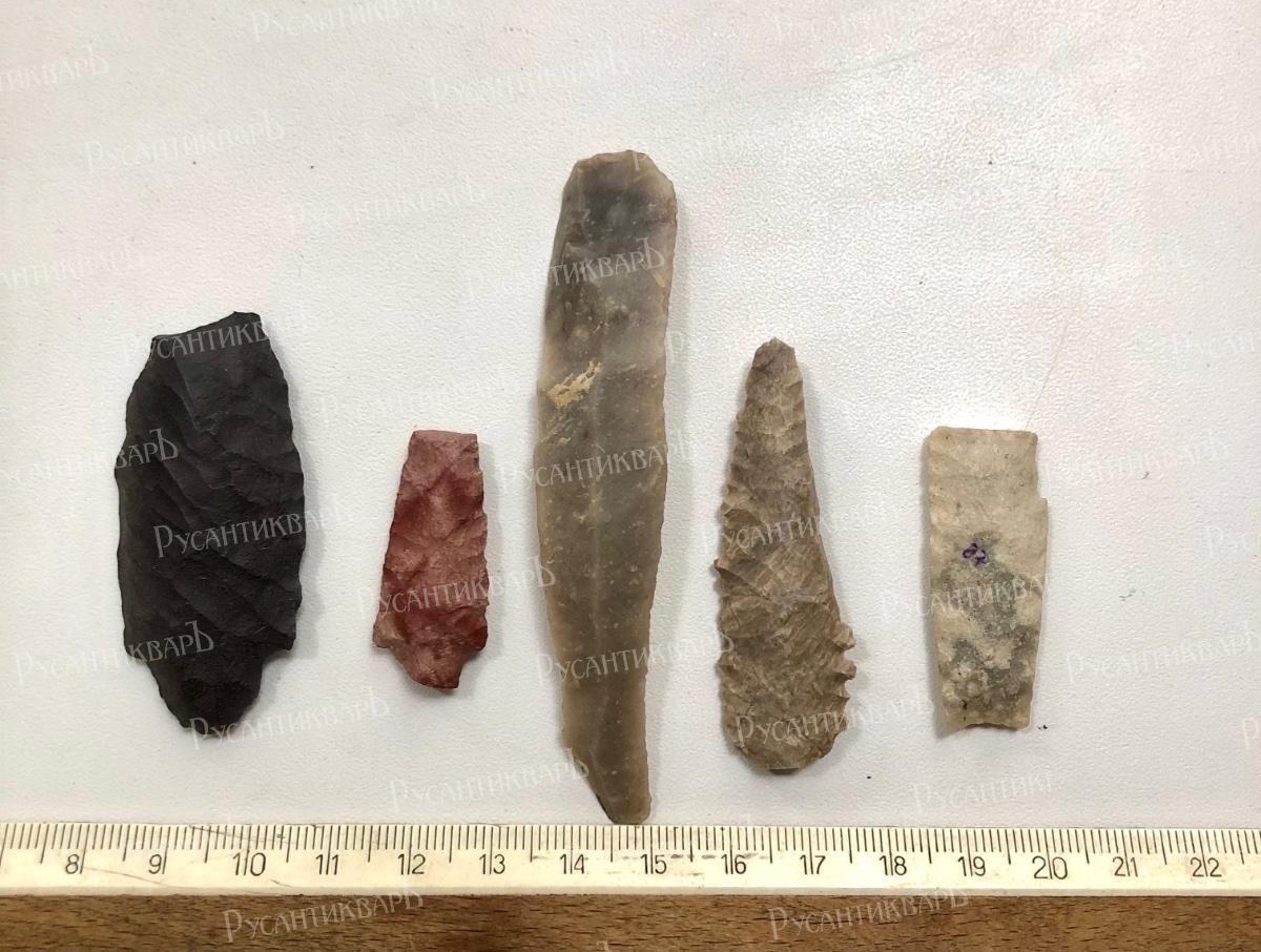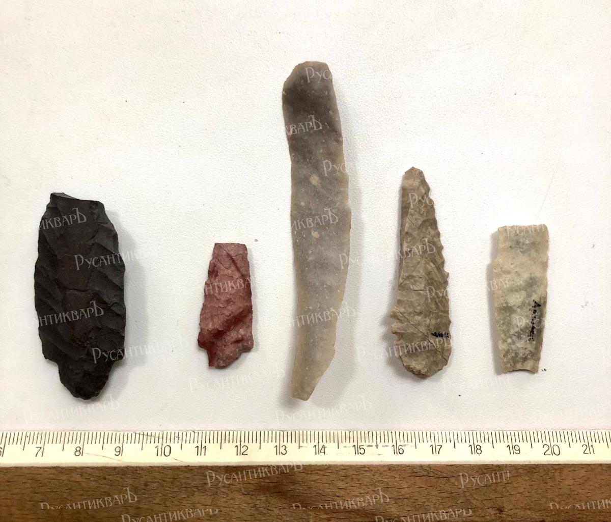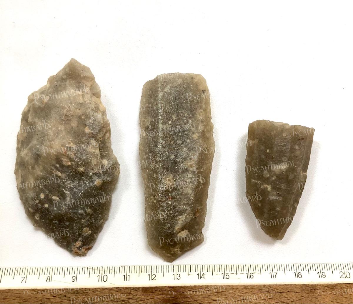 Ножевидная пластина,наконечники стрел.Кремень.Город Аральск,68 разъезд Аральского района Кзыл-Ордынской области Казахстан.Бронзовый век (XV—XI вв. до н. э.) .Тазобагъябская культура.Находка 1985-1987 гг.