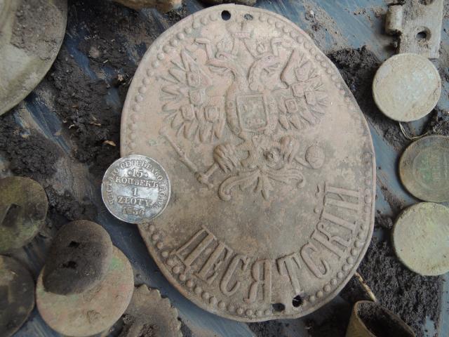 Один из первых цветных сигналов был должностной знак сельского старосты "Десятский" торчал немного в акуратой из земляной горки с морем крупного металла - трубы от кровати, листовой мет. с кровли и т.д. своей старой Теркой я б его не за что не нашел, а Деус четко выхватил цветнину !