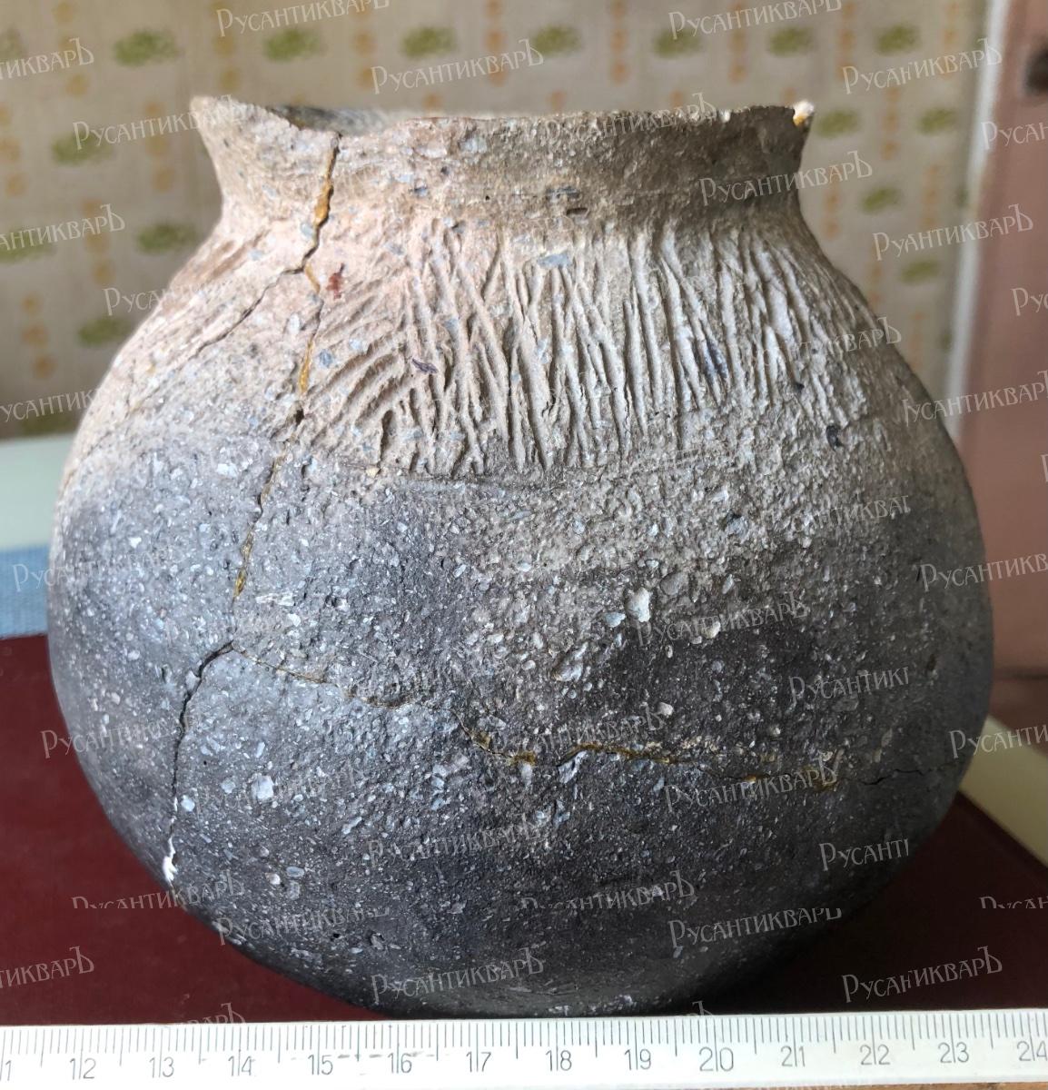 Круглодонный горшок.Глина с примесью толченых раковин.Пустыня Большие Барсуки,поселок Шижага Аральского района Кзыл-Ордынской области Казахстан.Бронзовый век (XV—XI вв. до н. э.) .Тазобагъябская культура.Находка 1985 года.Склеен,недостающий фрагмент восстановлен гипсом.