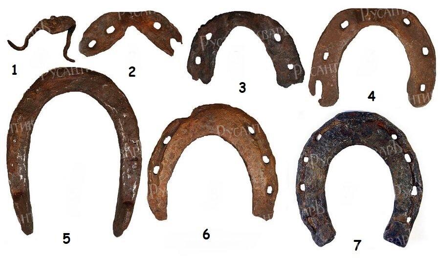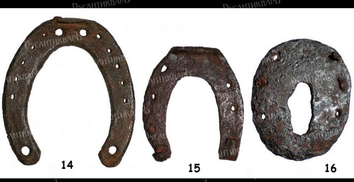 * Образец №16: Подкова XVI-XVII вв. (Подкова в виде овальной пластины с овальным отверстием посередине. Имеет по три гвоздевых отверстия с каждой стороны, а гвозди с заостренными шляпками заменяли шипы. Относятся к типу восточных.