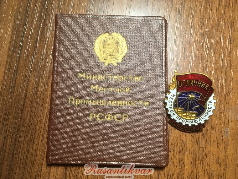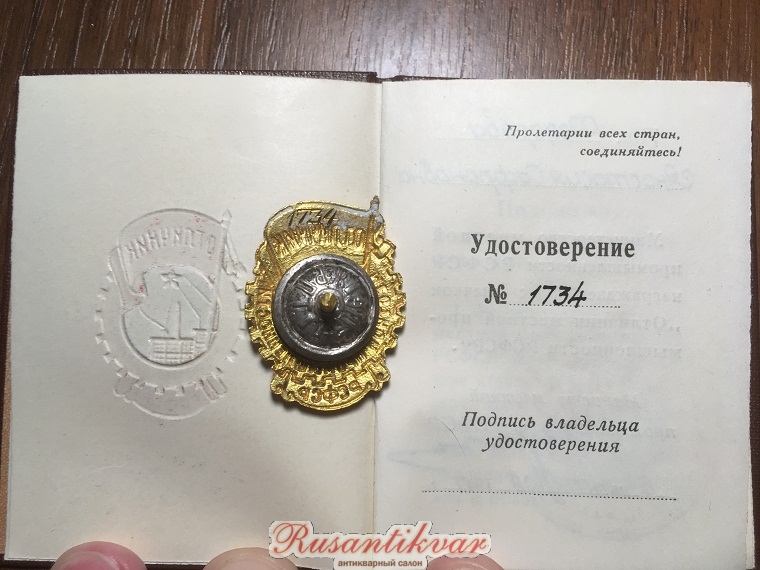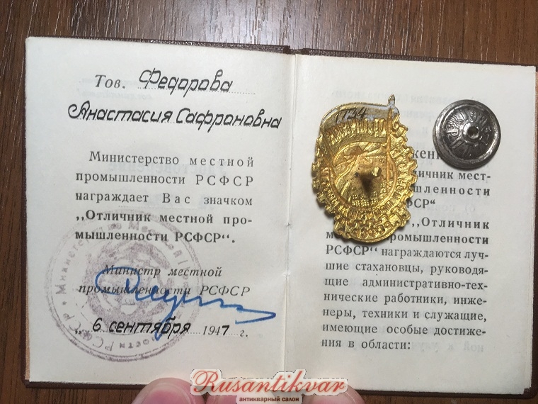 Знак Отличник местной промышленности №1734 на документе, ред