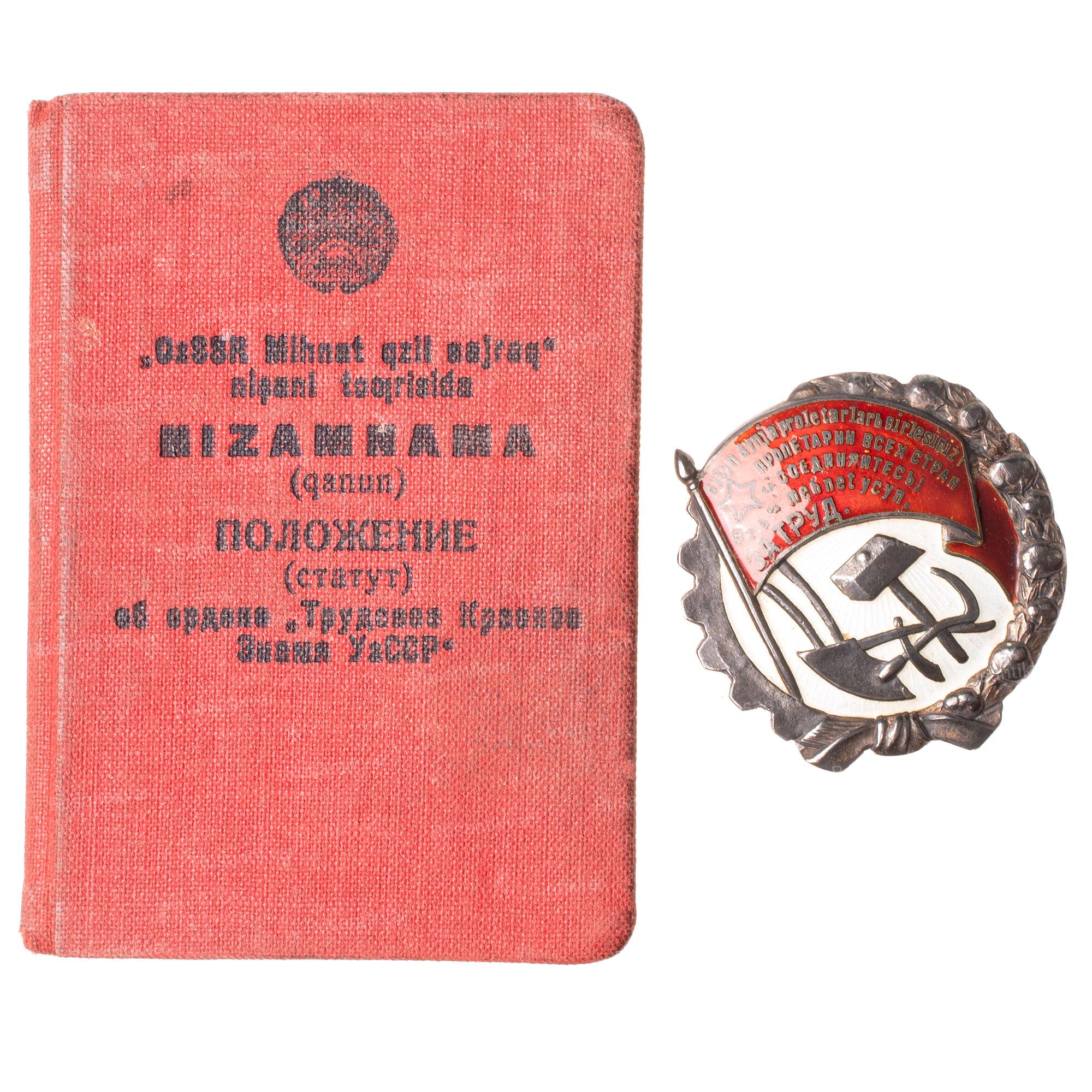 Специальным постановлением ЦИК УзССР от 7 июля 1926 года был принят и введен в действие Статут ордена Трудового Красного Знамени Узбекской ССР. В нем, в частности, говорилось: «Знак ордена «Трудовое Красное Знамя УзССР» может присуждаться не только гражданам и коллективам УзССР, но, равным образом, и гражданам и коллективам всех других республик, входящих в Союз ССР, а также гражданам и коллективам иностранных государств». Далее в Статуте оговаривались: порядок представления к награждению орденом, правила его ношения, права коллективов прикреплять орденский знак к своим знаменам, преимущества награжденных, условия лишения ордена и многие другие вопросы, касающиеся этой темы. Всего Статут узбекской трудовой республиканской награды содержал 26 отдельных пунктов и положений. Вместе с орденом награжденному предусматривалось вручение грамоты, в которой помещались фотография кавалера, рисунок ордена и соответствующий текст на узбекском и русском языках. Однако изготовление этих грамот по разным причинам было задержано, и их выдача началась лишь в 1931 году. До этого времени все награжденные орденом Трудового Красного Знамени Узбекской ССР получали временное удостоверение о награждении, отпечатанное на бланке ЦИК Советов Узбекистана и заверенное подписями Председателя и Секретаря ЦИК УзССР.