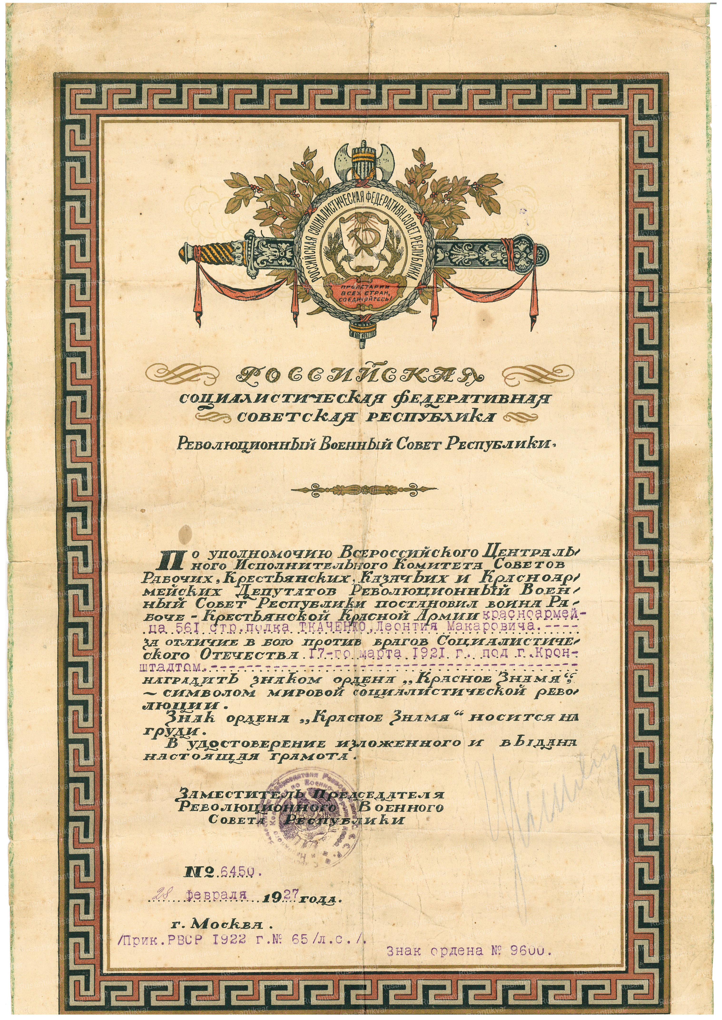 РВС, утвердивший награждение: не установлен (согласно документам ЦАМО, награжден в 1920 году)