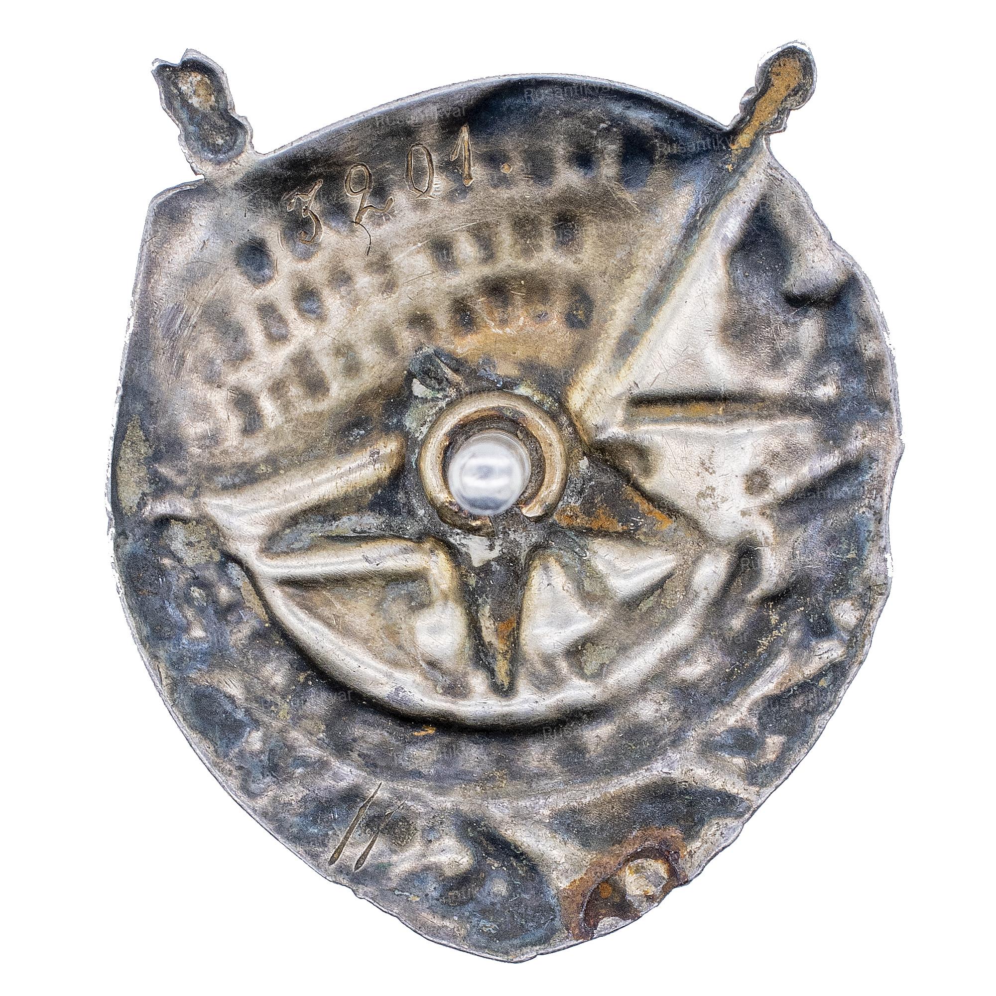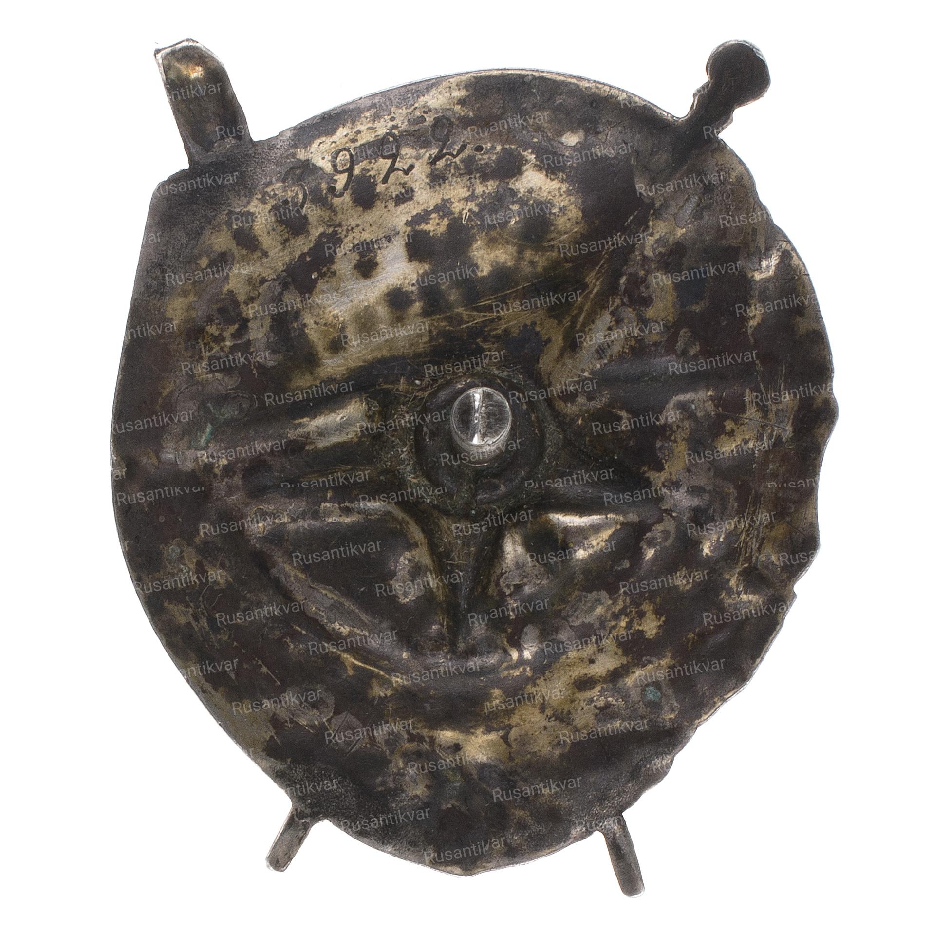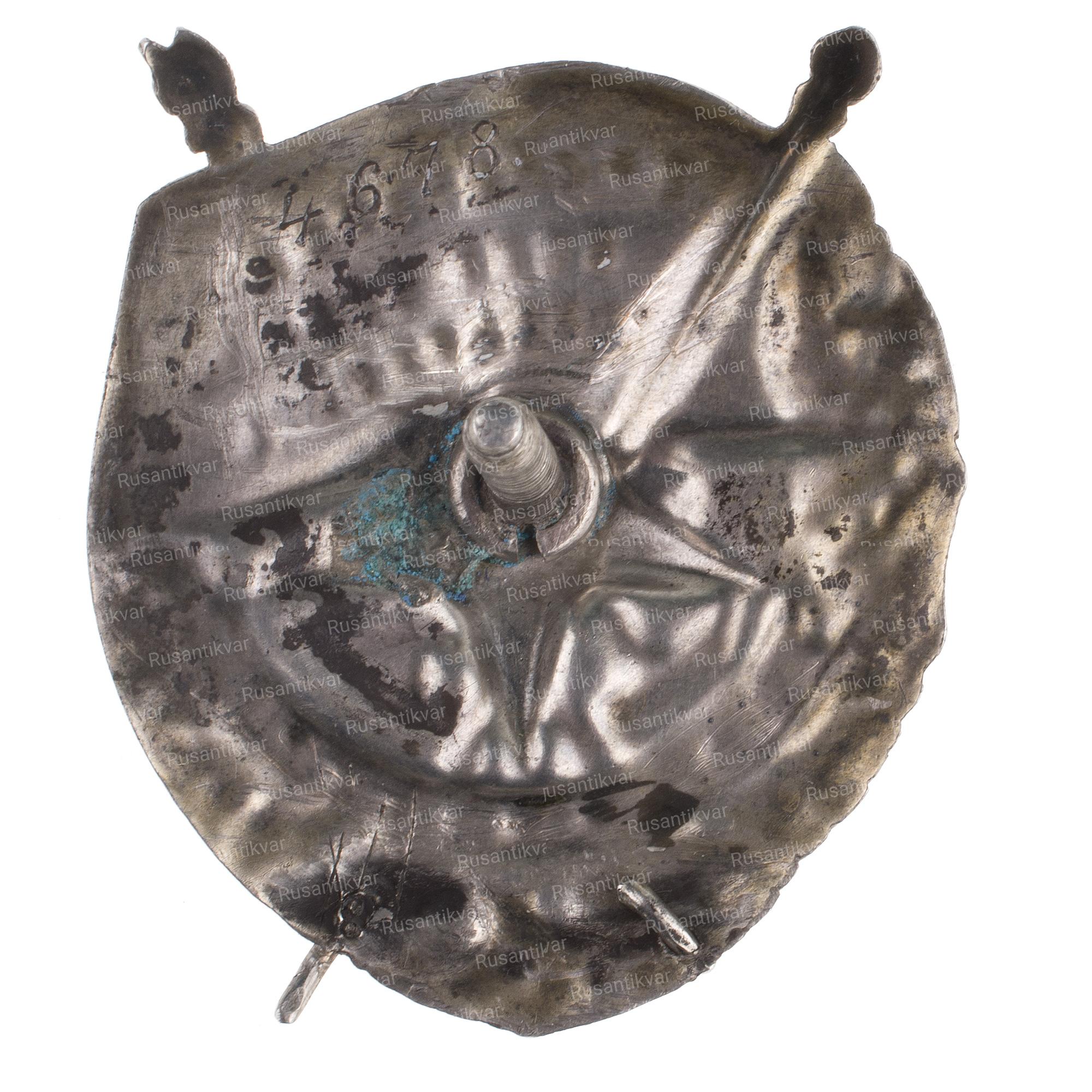 Учреждён 16 сентября 1918 г декретом ВЦИК. Петроградский Монетный двор, 1919 - 1929 гг . Серебро, золочение, эмаль, 26.2 гр. Размеры 36.3 х 41 мм. Сохранность хорошая (XF), две нижние выступающие части восстановлены, прижимная пластина и гайка от другого знака. Н. Стрекалов, И. Сысолятин "Награды Советских республик", Стр 11.
