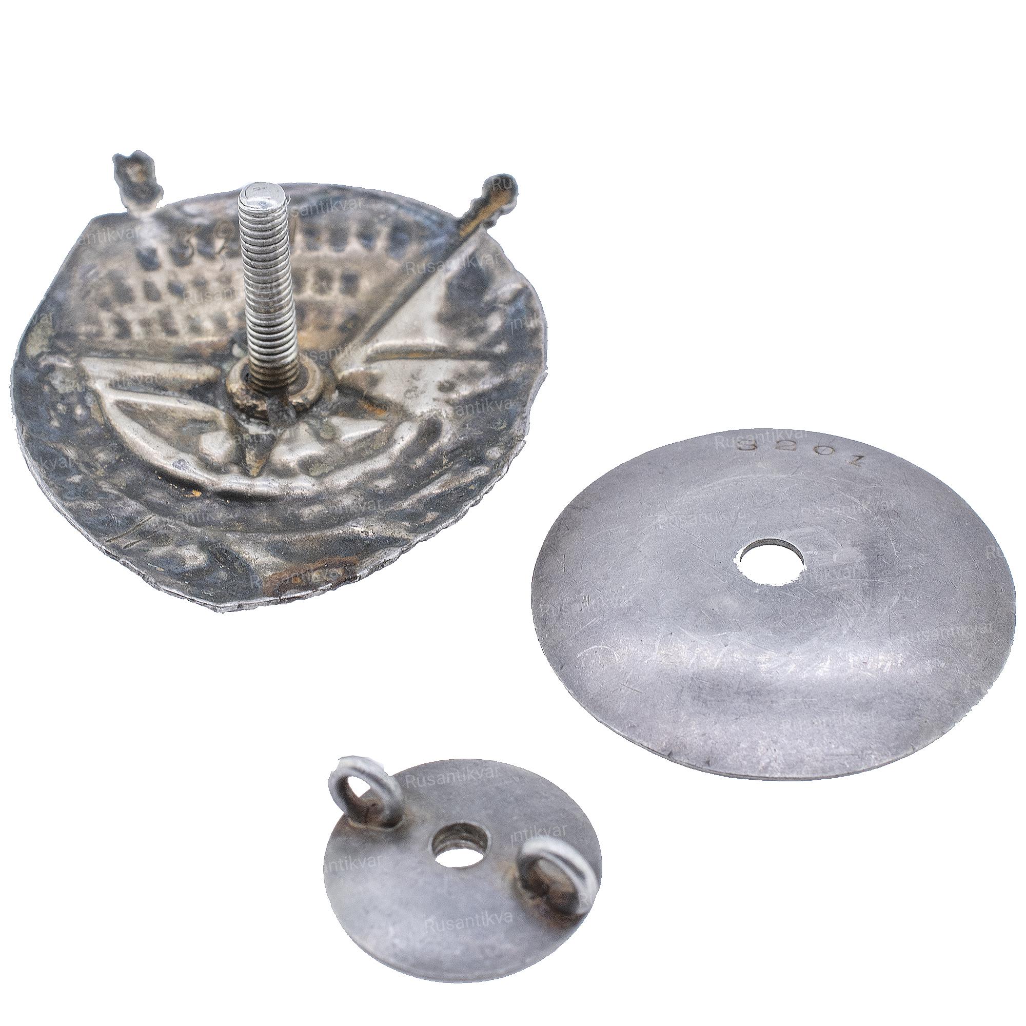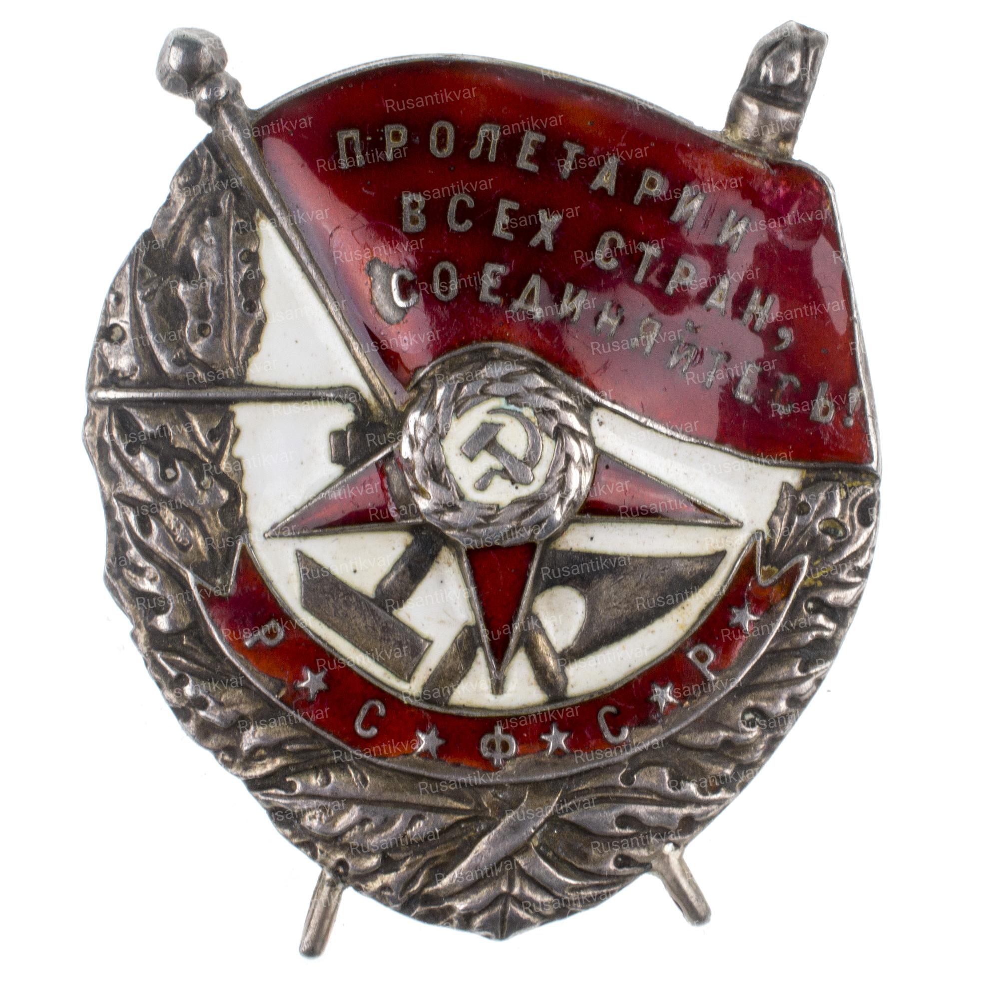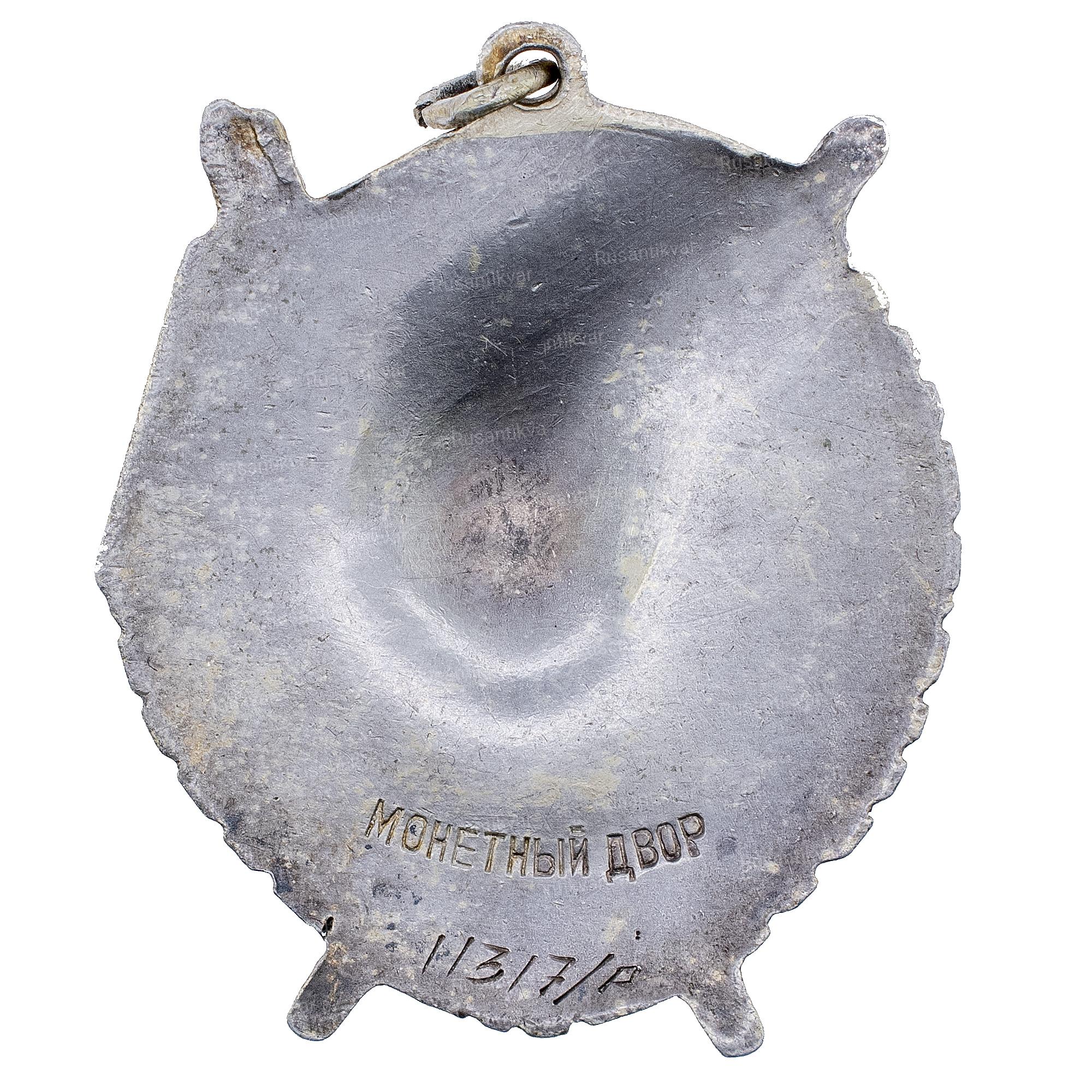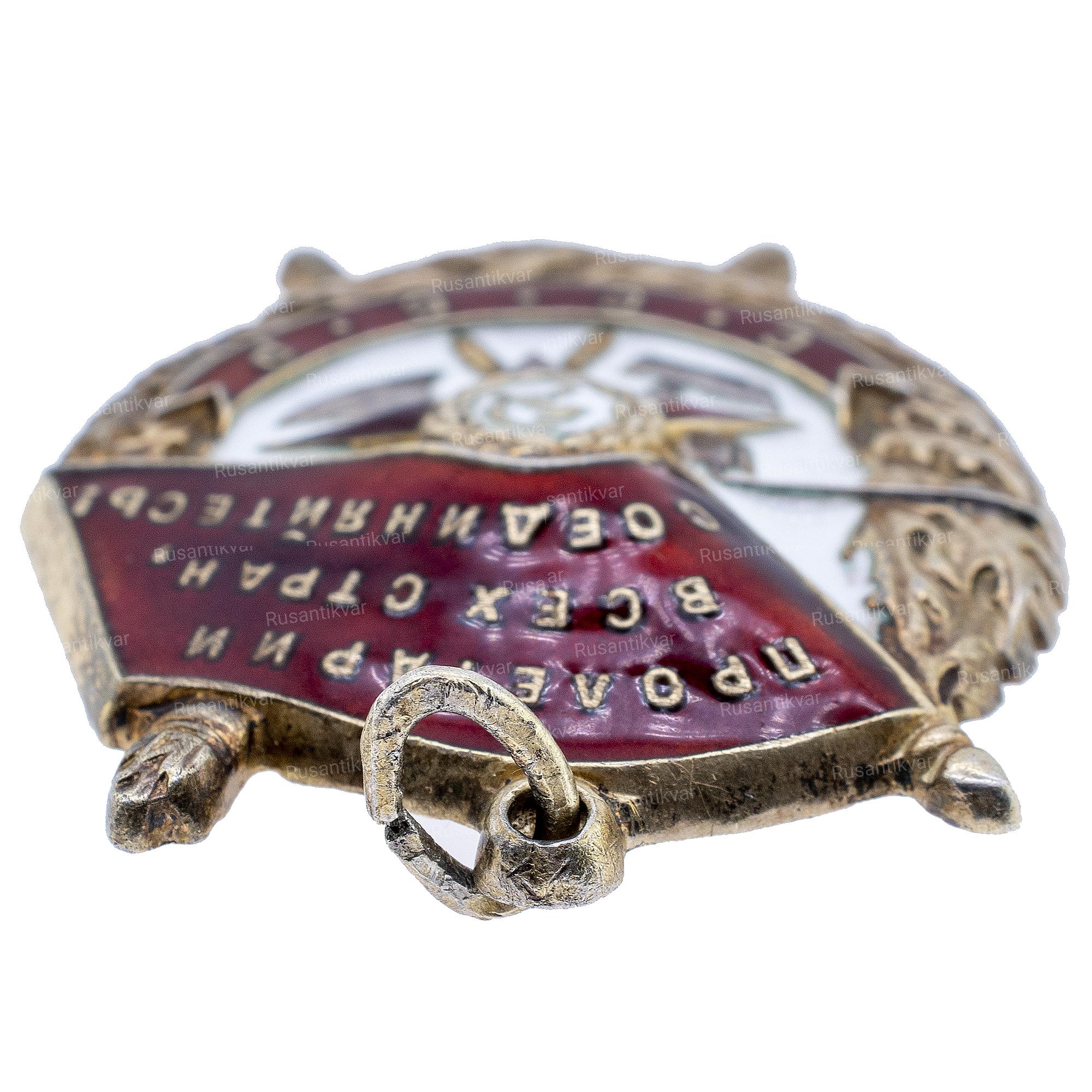 Учреждён 16 сентября 1918 г декретом ВЦИК. Петроградский Монетный двор, 1919 - 1929 гг . Серебро, золочение, эмаль, 26.2 гр. Размеры 36.3 х 41 мм. Сохранность хорошая (XF), две нижние выступающие части восстановлены, прижимная пластина и гайка от другого знака. Н. Стрекалов, И. Сысолятин "Награды Советских республик", Стр 11.