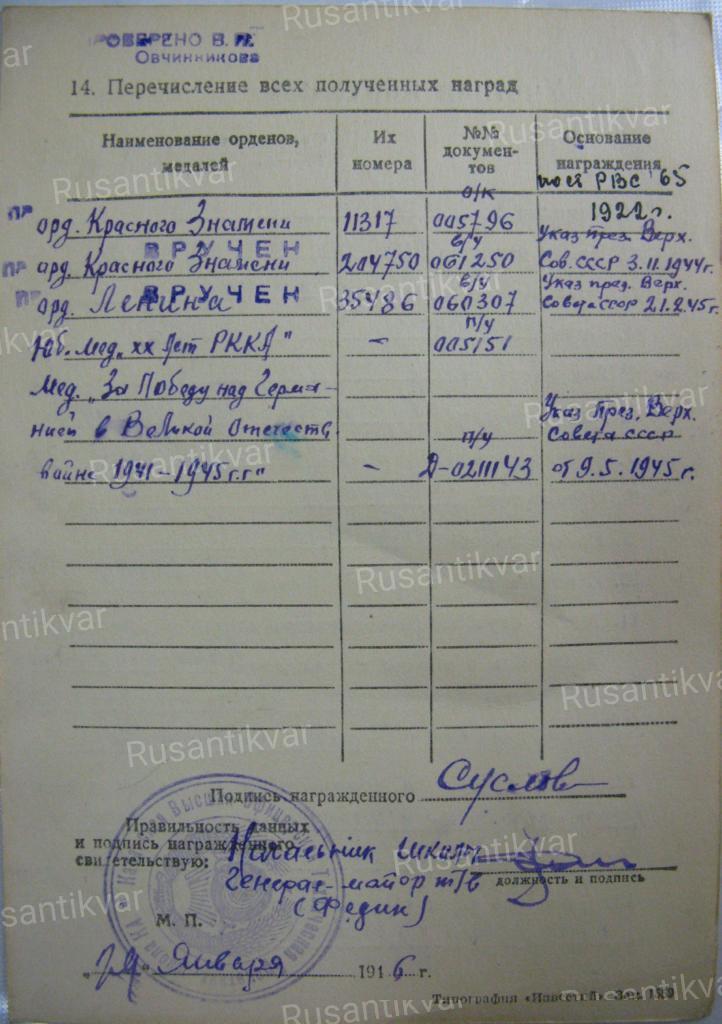 Награждение: РВС 11 Армии (не обнаружено, знак ордена вручен лично членом РВС Кавказского фронта Г.К.Орджоникидзе, возможно без проведения приказом по Армии).