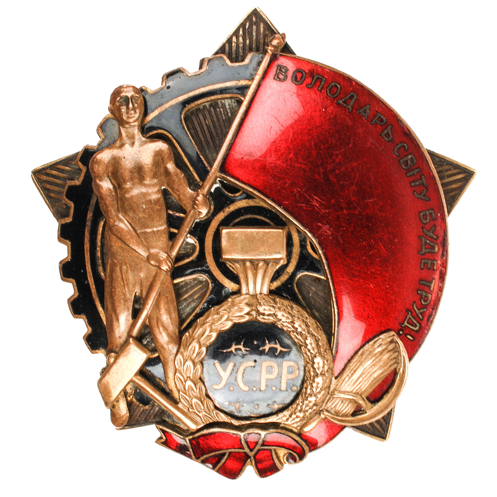 Согласно решению Съезда, новая комиссия должна была состоять из членов Президиума ВУЦИК и могла награждать как отдельных лиц, так и целые коллективы и предприятия. С 20 апреля был открыт конкурс, продлившийся один месяц, в котором должны были определить лучший эскиз высшей награды республики. В конкурсе победил проект под названием «Конец разрухе», в который были внесены незначительные поправки. На эскизе имелся рисунок рабочего, в руках держащего развернутый красный флаг. Он стоял на фоне 5-конечной звездочки и зубастой шестерни. На украинском языке на флаге было написано: «Владыкой мира будет труд» - это была строка из популярной революционной песни.