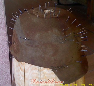 Теперь его нужно было скрепить до кучи , чтобы натянуть на деревянный болван . Вот так : Гвоздики - для придания формы в местах разрывов и утрат .