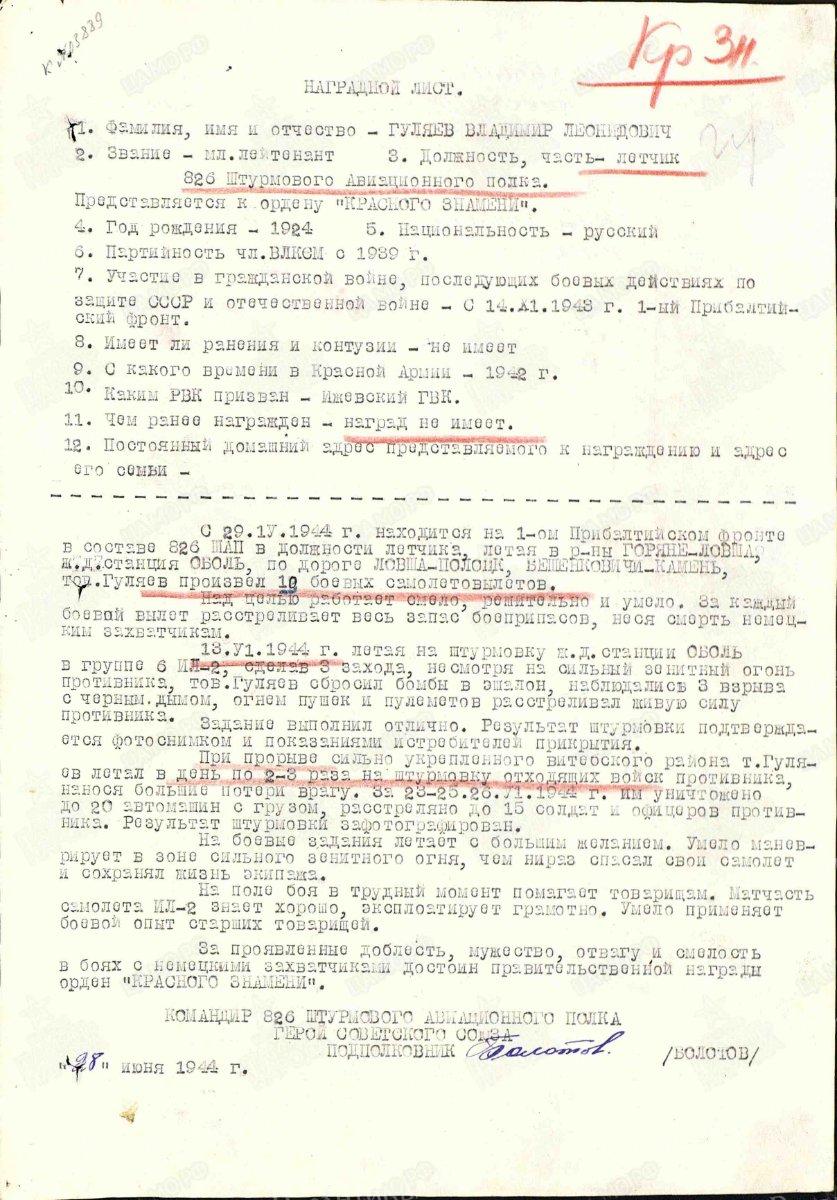 В дальнейшем Гуляев ещё несколько раз был ранен, переболел малярией, заработанной на лесном белорусском аэродроме. Ранения в голову оставили шрамы на его лице – на переносице и подбородке.Совершил 60 боевых вылетов на самолёте Ил-2. Воевал в Белоруссии, Прибалтике. В 1944—1945 годах — лётчик 826-го штурмового авиационного Витебского орденов Суворова и Кутузова полка 335-й штурмовой авиадивизии 3-й воздушной армии. Вместе с полком участвовал в Городокской, Белорусской, Витебско-Оршанской, Полоцкой, Шяуляйской, Прибалтийской, Рижской, Мемельской, Инстербургской, Восточно-Прусской, Кёнигсбергской и Земландской операциях, в блокаде и ликвидации Курляндской группировки. Войну закончил лейтенантом в Восточной Пруссии.24 июня 1945 года лейтенант Гуляев снова прошёл по Красной площади, вместе с сотнями соотечественников-победителей. Участие в Параде Победы с тех пор для него стало, по его словам, самым главным событием в жизни. Из-за фронтовых ранений 30 ноября 1945 года уволен из армии по состоянию здоровья после прохождения медицинской комиссии.