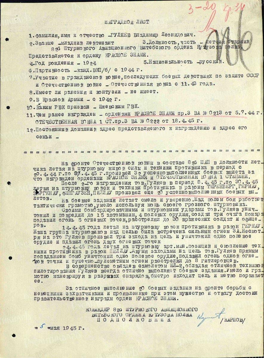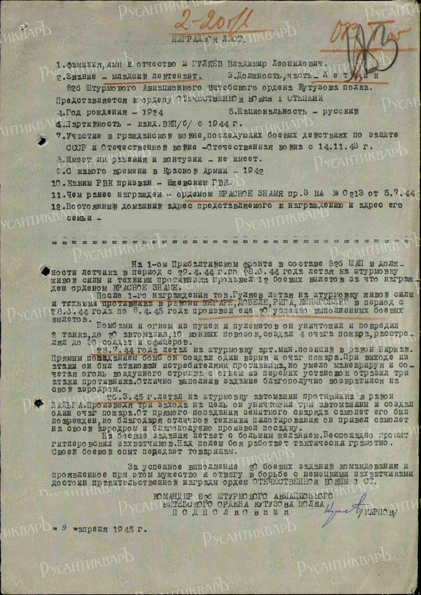 Владимир Леонидович Гуляев родился 30 октября 1924 года в Свердловске, в семье военного. Его отец, Леонид Михайлович, носил звание подполковника и служил в должности заместителя начальника политотдела Молотовской военной авиашколы. Мать Владимира была педагогом. Семья Гуляевых была очень музыкальной – Леонид Михайлович играл на баяне, а его супруга – на семиструнной гитаре, оба замечательно пели.Во время Великой Отечественной войны пошёл работать слесарем в авиационную мастерскую,а 1942 году в 17 лет Владимир был принят в Молотовскую авиашколу, которая выпускала лётчиков-бомбардировщиков. К осени 1942 года Гуляев, закончив программу обучения, уже приступил к самостоятельным полётам. Через месяц-полтора ему предстояло получить звание сержанта и отправиться в часть, на фронт. Однако пришлось доучиваться на пилота-штурмовика. Гуляев переучился хорошо — закончил авиашколу младшим лейтенантом.После училища выпускники неделю провели на пункте сбора летно-технического состава, а потом отправились на фронт — 6 ноября 1943 года, прямо с Красной площади. Сначала его определили в 639-й полк 211-й штурмовой авиадивизии, затем полк передали во вновь организованную 335-ю штурмовую авиадивизию. На самолётах Ил-42 ему довелось летать над небом Белоруссии, Прибалтики и Восточной Пруссии. Он совершал по нескольку боевых вылетов в день и слыл бесстрашным лётчиком. Рискуя жизнью, под обстрелом зенитных орудий, он много раз совершал точное попадание в цель и возвращался невредимым. Ему везло. Про подвиги Гуляева даже выходили статьи в армейской газете «Советский сокол».