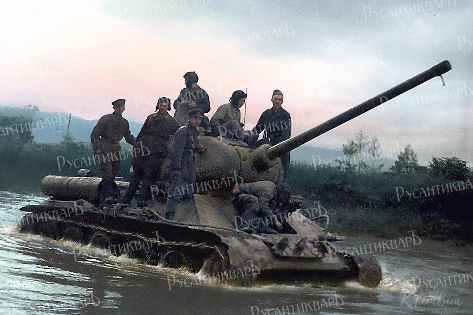 Танк Т-34 форсирует реку Хандавас-гава на Южном Сахалине, 1945 год.