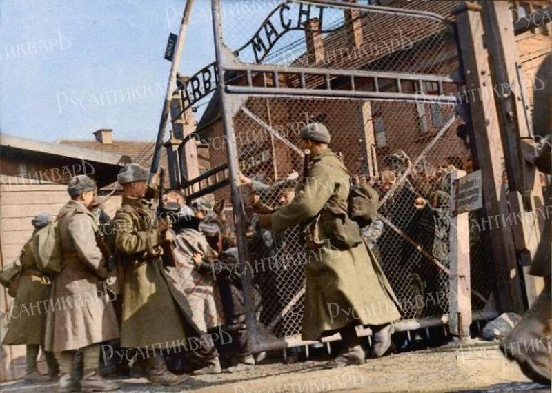 Красноармейцы открывают ворота Освенцима со знаменитой надписью на них «Труд делает свободным» («Arbeit macht frei»).