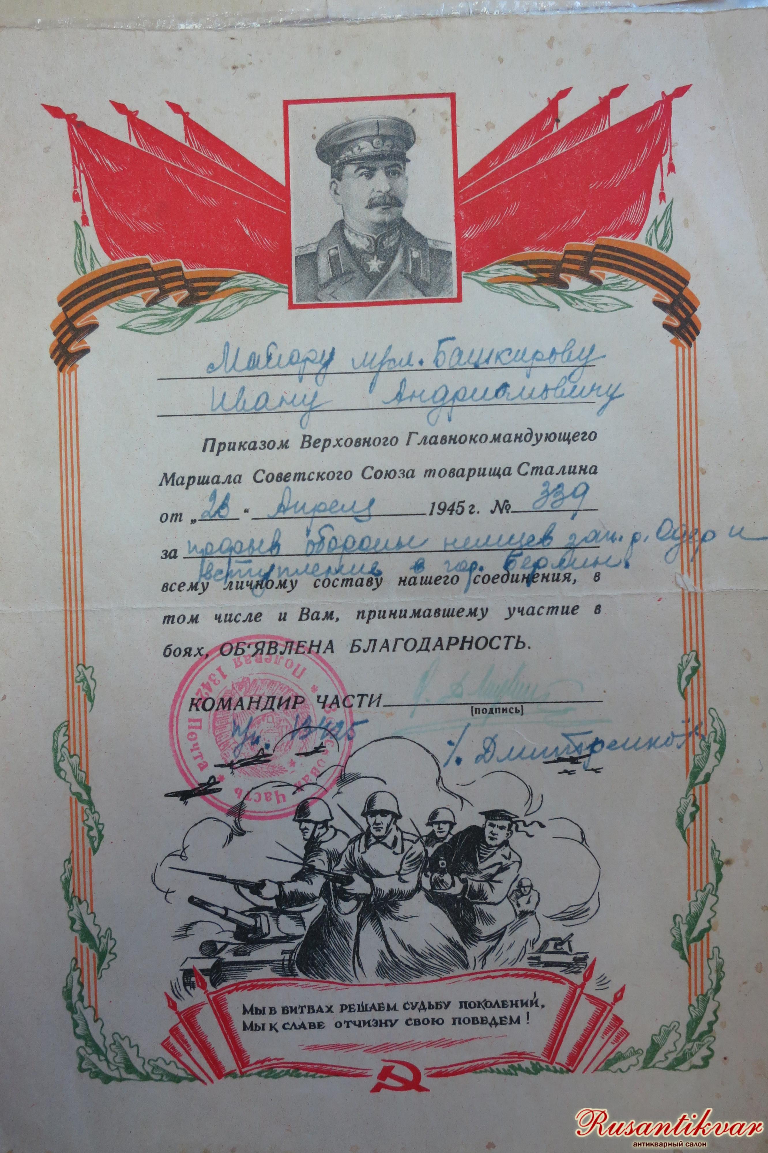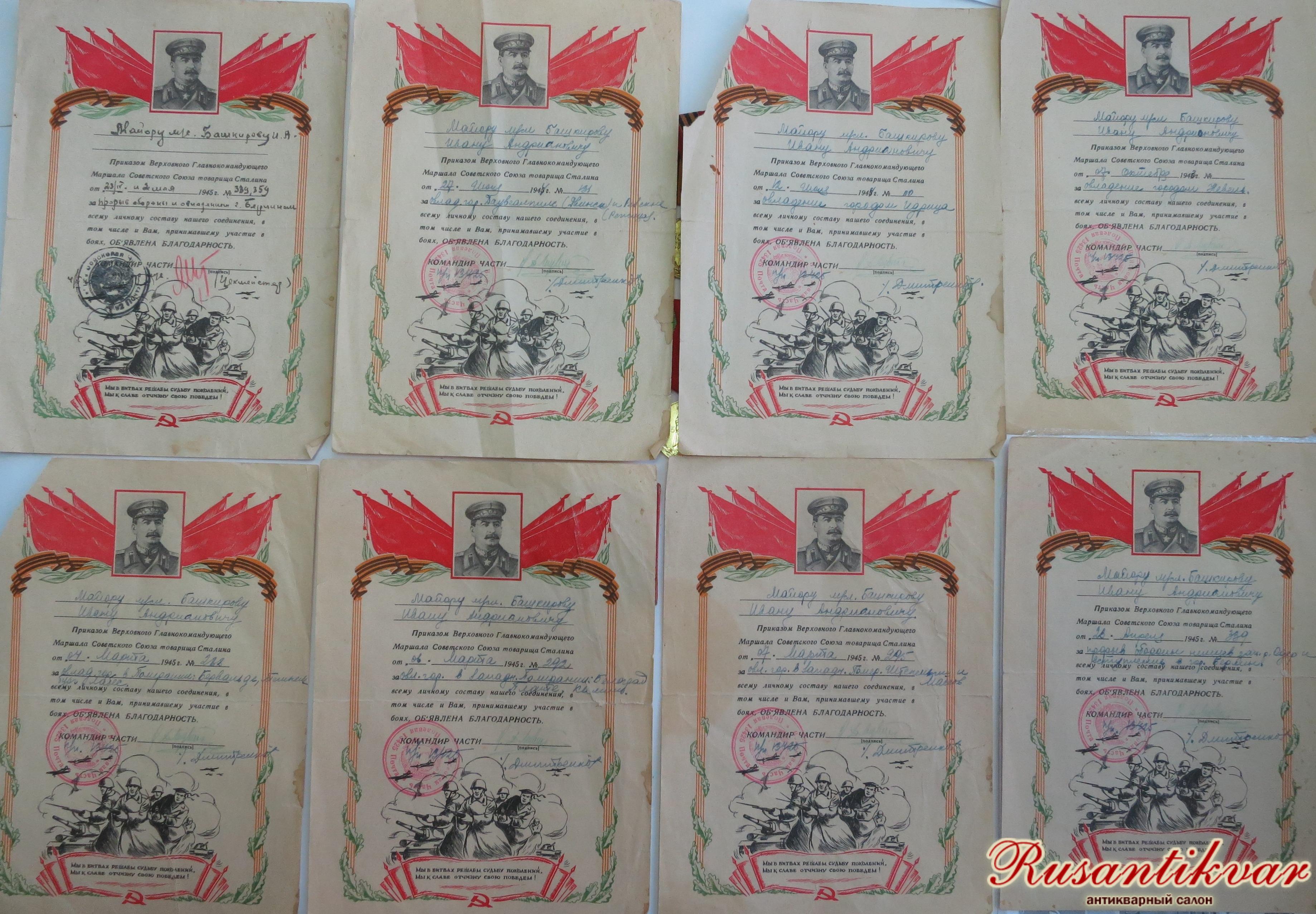 В семейном архиве Башкировых сохранилось немало документов. Среди них - «Удостоверение личности начальствующего состава РККА» от 1940-го года на имя военврача 3 ранга Башкирова Ивана Адриановича (отчество – так в документе). Имеется также целый ряд «Благодарностей», объявленных Верховным Главнокомандующим Маршалом Советского Союза товарищем Сталиным за 1943-45 гг., в которых объявляется, например: «благодарность всему личному составу соединения, в том числе и Вам, принимавшему участие в боях, за овладение городами …» (приводим перечнем): Невель, Идрицу, Даугавпилс (Двинск), Резекне (Режица), городами в Померании, за прорыв обороны немцев западнее р. Одер и овладение г. Берлином. Ему собственноручно удалось расписаться на стенах Рейхстага.