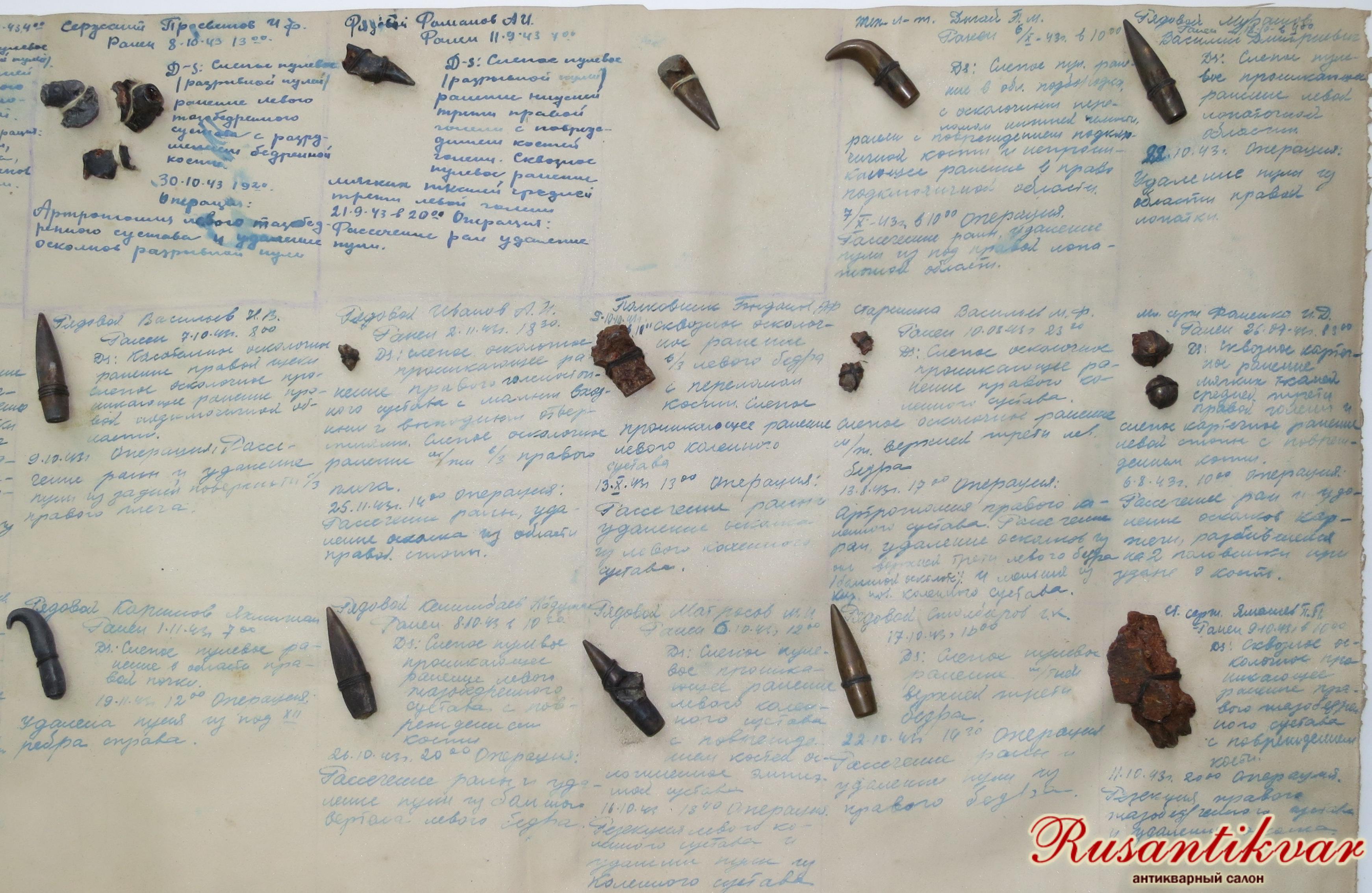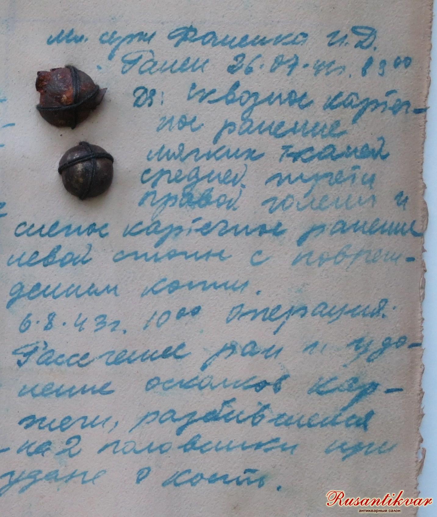 6.8.43 г. в 10.00 операция: рассечение раны и удаление осколков картечи, разбившейся на две половинки при ударе о кость.