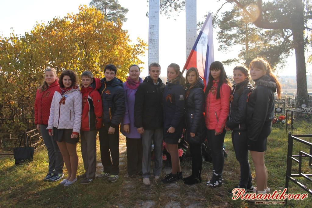 13. Кожевникова Екатерина (пятая слева) и ученики Горкинской средней школы Киржачского района Владимирской области, проводившие работу по увековечению памяти экипажа Петрова.