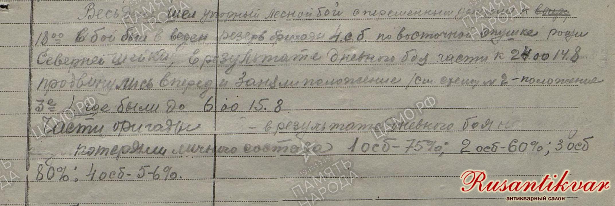 О напряжённости обстановки на участке фронта, где бойцы 120-й ОСБР атаковали немецкие позиции и существенных потерях при наступлении говорят и документы ЦАМО. Например, в одном из боевых приказов командира бригады полковника Альбикова за август 1942 года говорится о пополнении поредевших батальонов за счёт зачисления в стрелки тыловиков и солдат из обслуги: «За счёт сокращения тылов батальонов и спецподразделений довести численность активных штыков до 200 человек…», то есть на замену выбывшему личному составу направлялись связисты, водители, артиллеристы, солдаты химвзвода. Все они экипировались, получали вооружение и шли в бой: «…Выделенных людей вооружить винтовками, по боекомплекту патронов, две гранаты РГД, противогаз, лопата. Выделение и отправку закончить к 15-00 26.08.42 г.».