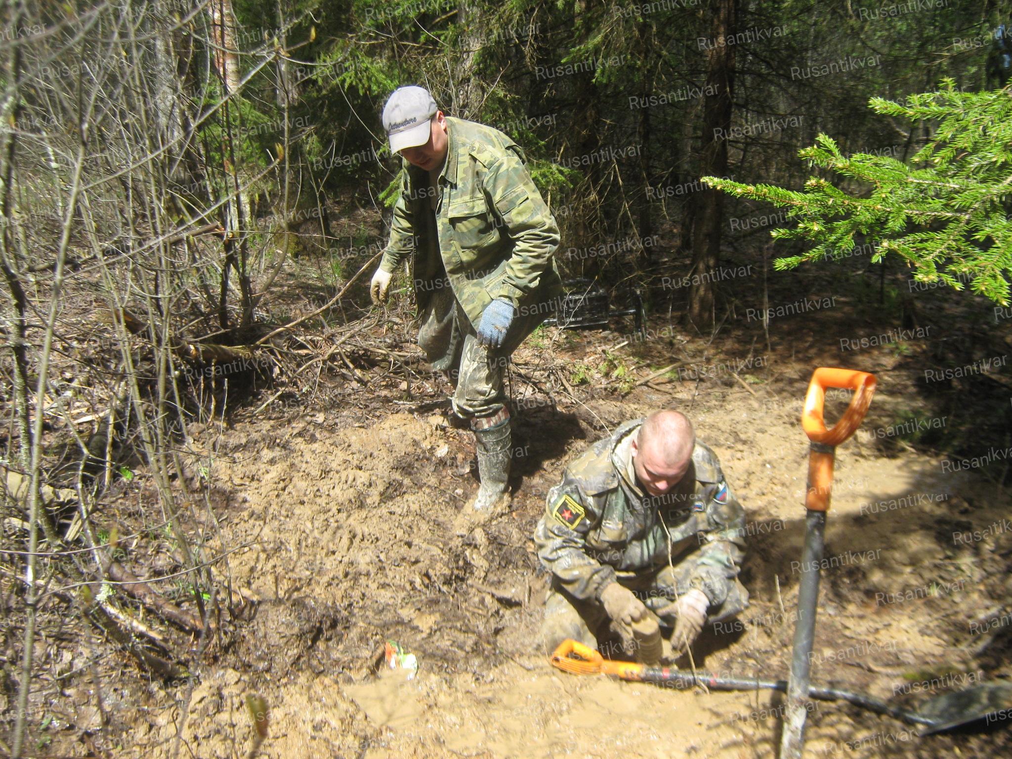 День подходил к концу, казалось, что всё, сегодня мы, несмотря на упорный труд, никого не найдём. Но, при подъёме по лесу от речки вверх на деревню Строино у одного из наших ребят прибор издал обнадёживающий звук. К счастью, так и произошло. Мы нашли «верхового» солдата, погибшего от разрыва миномётного снаряда…