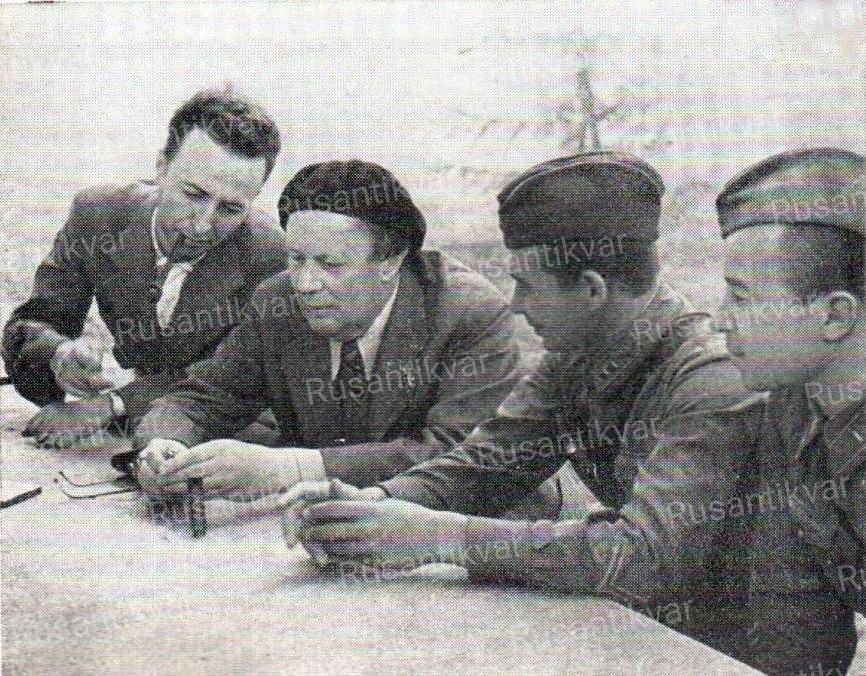 На фото: Алексей Толстой и корреспондент «Красной звезды» Дмитрий Медведовский вместе с летчиками, защищающими небо Москвы. Аэродром Внуково, Август 1941 г.