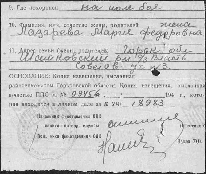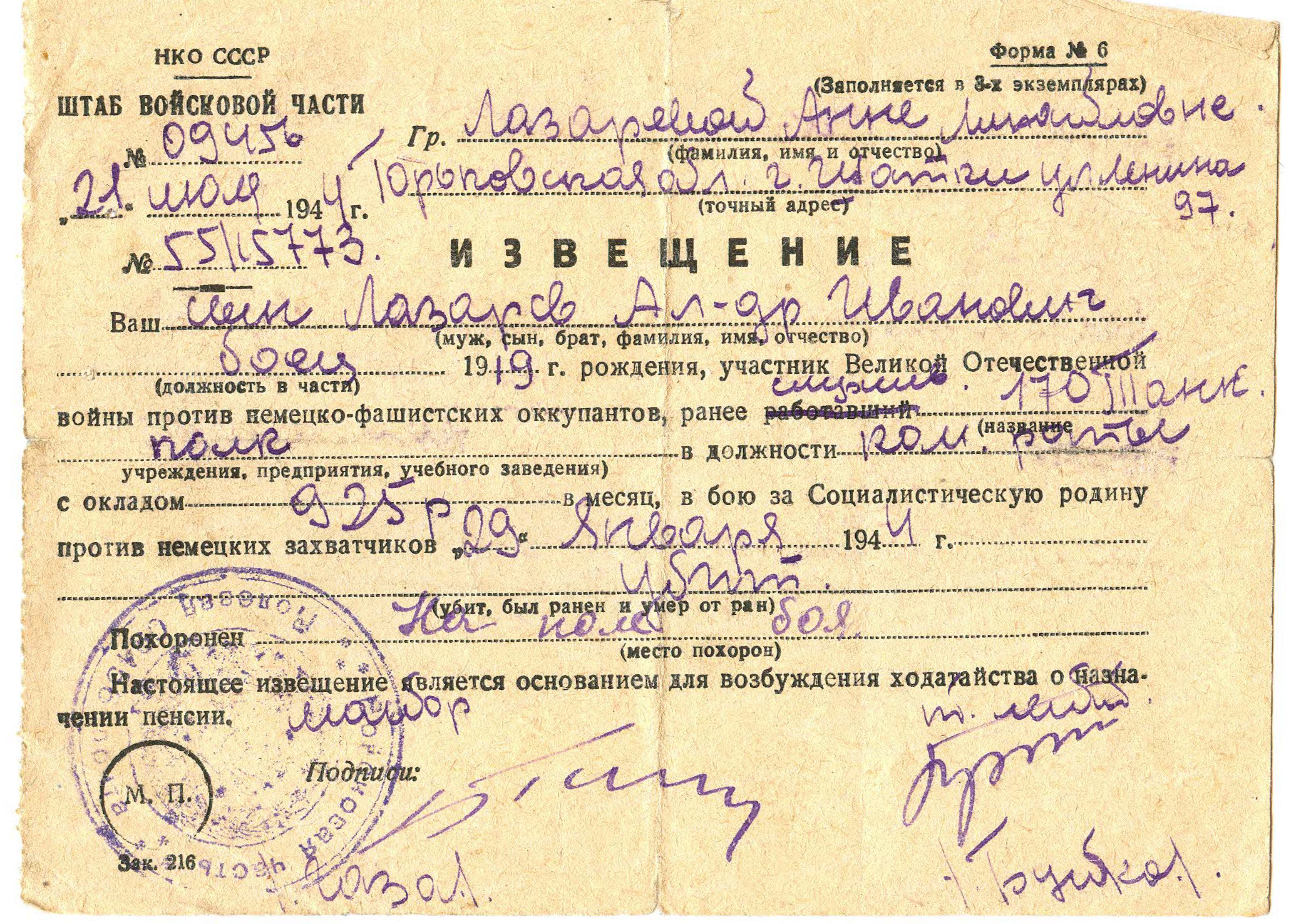 «Ваш сын, Лазарев Александр Иванович, боец, 1919 г. рождения, служил в 170-м танковом полку в должности командира роты. В бою за социалистическую Родину против немецких захватчиков 29 января 1944 года убит. Похоронен на поле боя».
