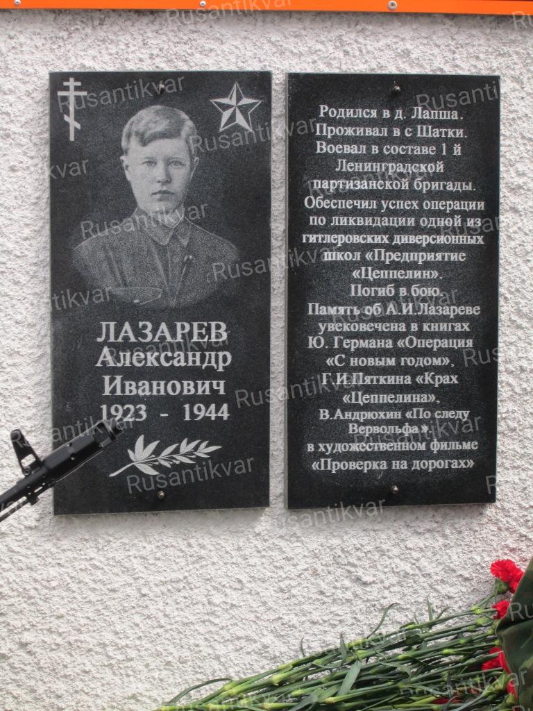 В мае 2016 года, в канун 71-й годовщины Победы советского народа в Великой Отечественной войне, на мемориальном комплексе «Никто не забыт, ничто не забыто» в поселке Шатки Нижегородской области состоялось открытие памятной доски жителю посёлка Александру Ивановичу Лазареву.
