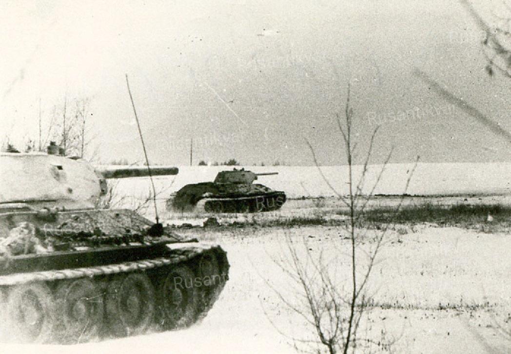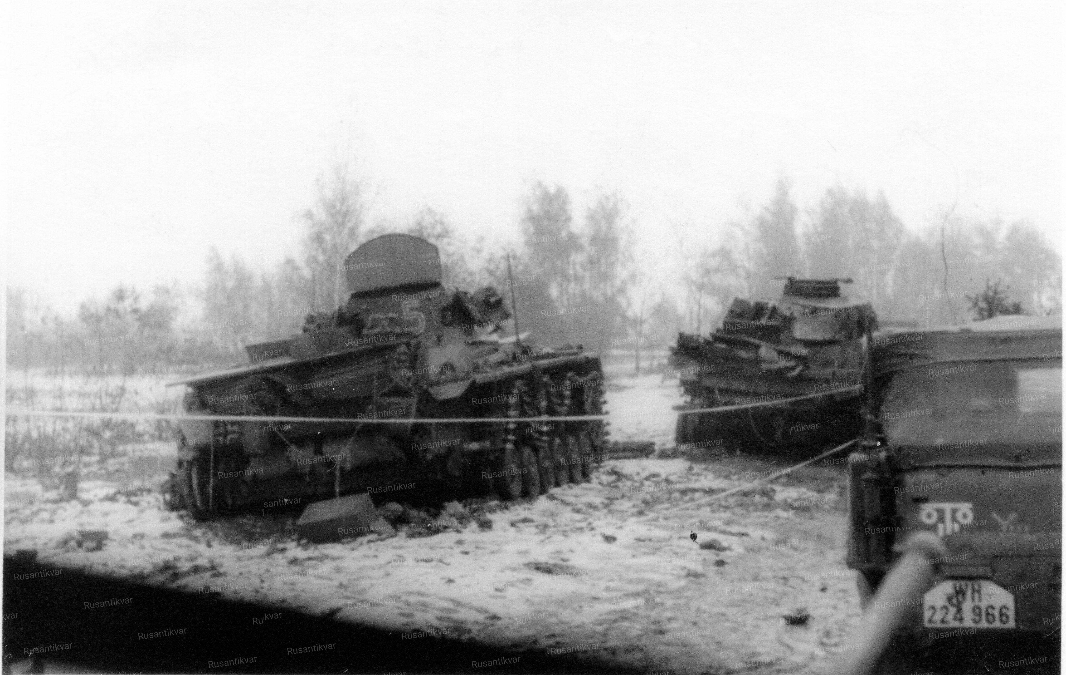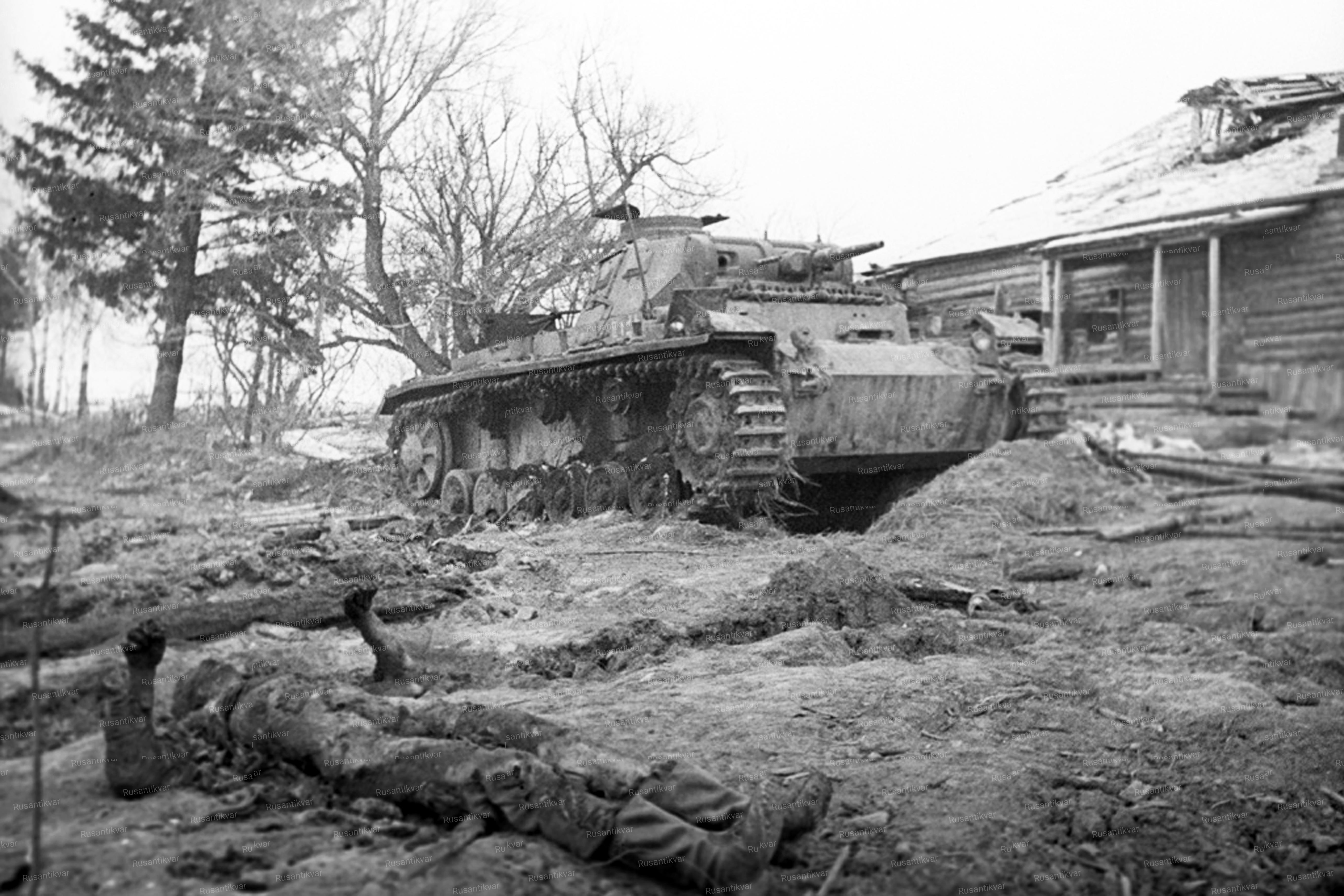 13. Снимок из фотоальбома военнослужащего 10-й танковой дивизии вермахта. Трофейный танк Т-34 на западной окраине Скирманово. В октябре 1941 года немцам удалось восстановить два танка Т-34. Они были включены в состав 7-го тп 10-й тд вермахта. Цифра 5 на башне указывает принадлежность к 5-й танковой роте. Один из танков был уничтожен в ходе боя за деревню.
