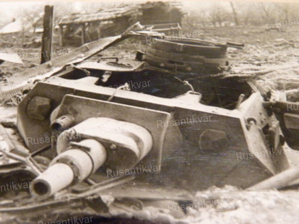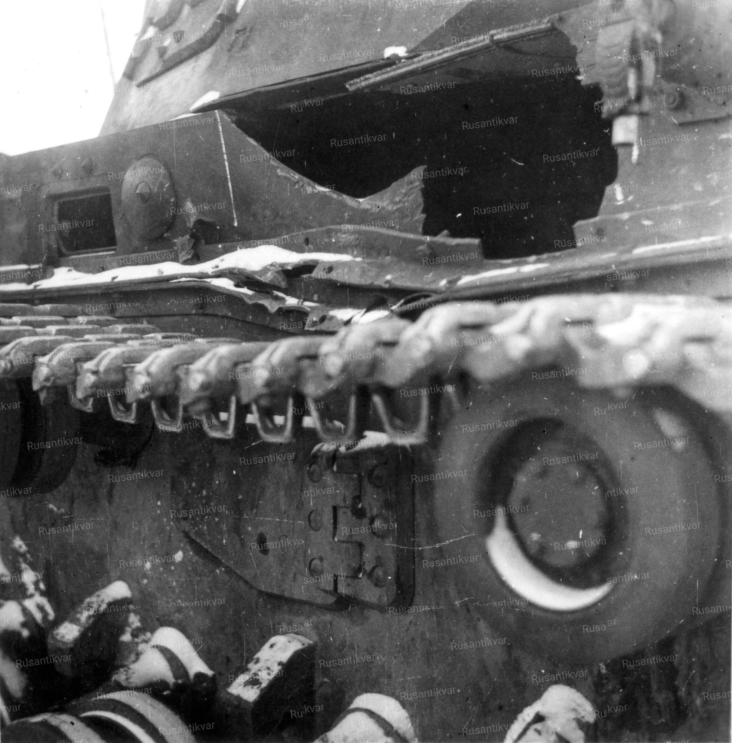 6. Результат прямого попадания снаряда крупного калибра в борт немецкого танка.